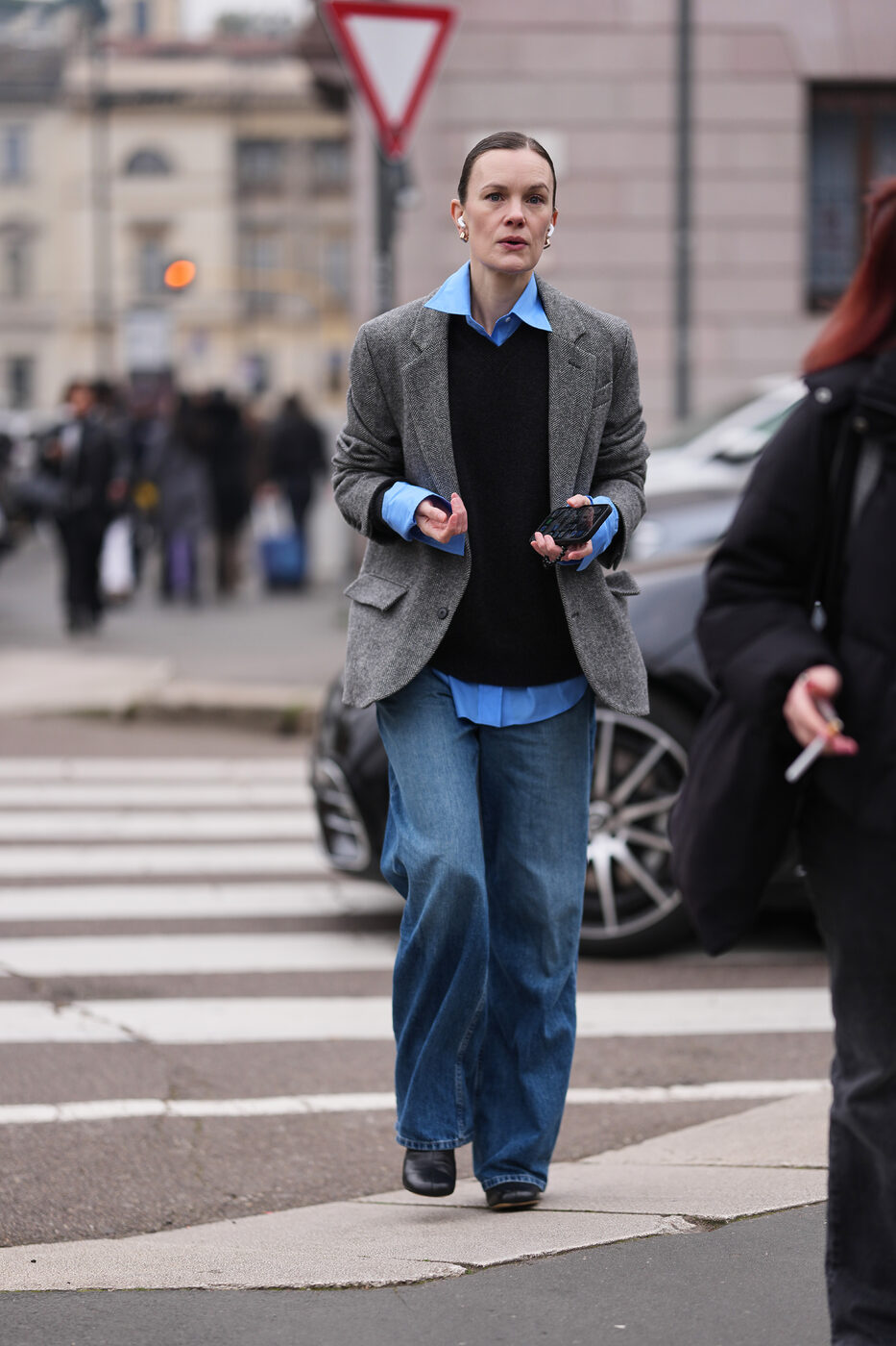 우리가 셔츠 위에 니트를 겹쳐 입는 이유는 단순히 추위를 피하기 위함만은 아닙니다. 셔츠의 정갈함과 니트의 부드러움이 만났을 때 생기는 그 특유의 ‘여유로움’을 즐기는 거죠. 이 룩에서도 그 무드가 느껴집니다. 헤링본 재킷과 블랙 니트 사이로 쨍한 블루 컬러 셔츠를 더해 보세요. 깃을 재킷 밖으로 살짝 빼고, 소매를 니트 위로 길게 늘어뜨리는 것만으로도 디테일을 놓치지 않는 옷잘알로 보이게 해줄 거예요.