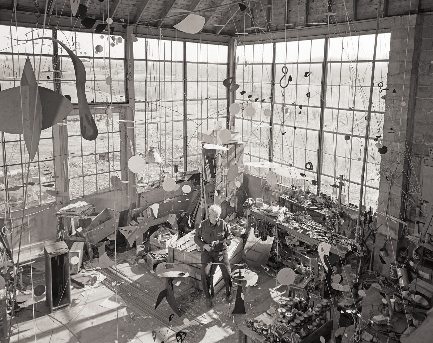 “요즘은 아이들도 철사나 유리로 뭔가를 만들지만, 칼더 이전에는 이런 작업 자체가 존재하지 않았어요.” 알렉산더 S.C. 로워가 뉴욕 첼시에 있는 칼더 재단 본부를 거닐며 설명한다. 칼더 재단은 20세기 초에 지어진 상업용 건물의 최상층에 자리하고 있다. 엄격하게 통제된 환경을 벗어나, 칼더가 의도한 그대로 작품이 움직이는 상태를 경험할 수 있는 곳은 사실상 여기뿐이다. 산들바람에 흔들리거나, 지나가던 사람이 살짝 건드린 탓에 미묘하게 흔들리는 순간들 말이다. “미술관에서는 이런 작품을 온전히 감상하기가 어렵습니다. 그런 움직임이 일어나지 않거든요.” 로워는 매달린 모빌 하나를 조심스레 밀며 말을 잇는다. “이 작품들은 진동하고, 일종의 활동성을 지니고 있어요. 마치 살아 있는 것처럼요.”