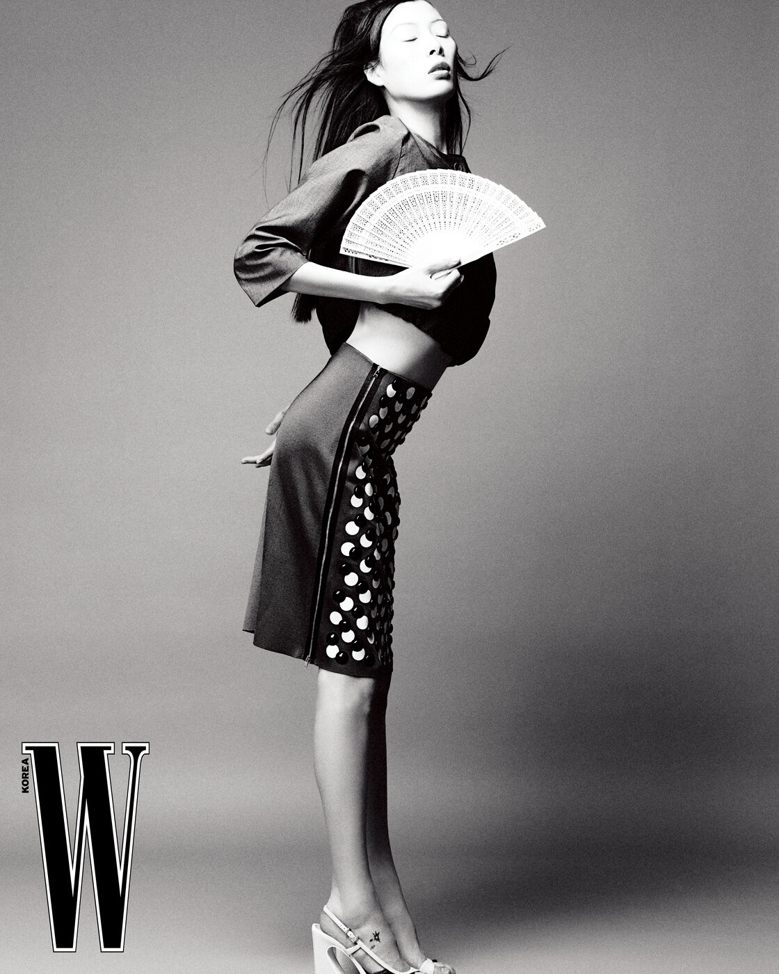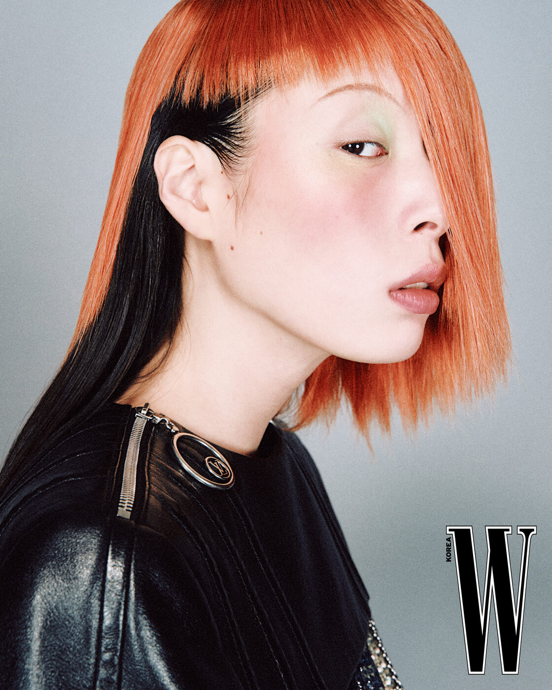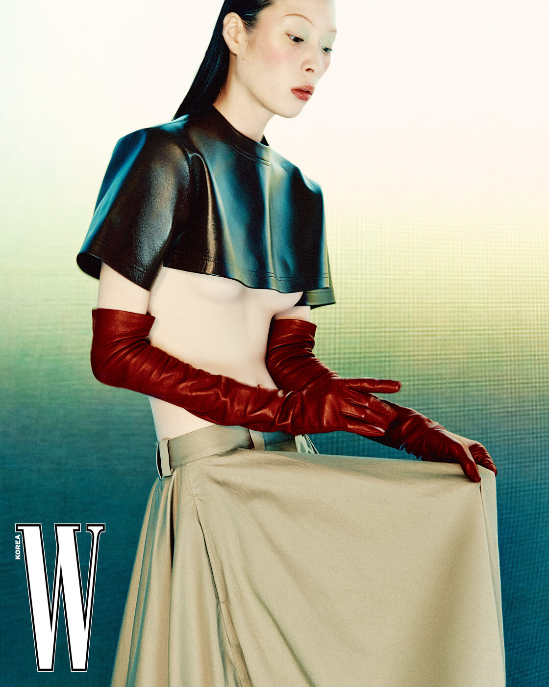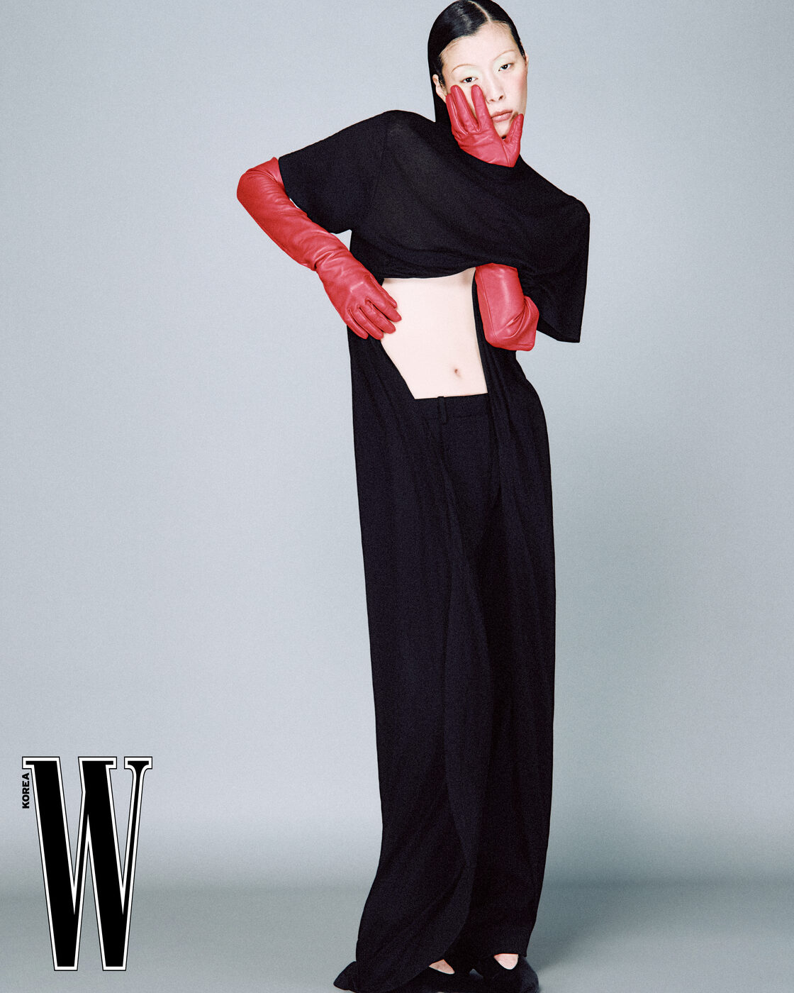 핑크색 가죽 글러브, 티셔츠, 테일러드 팬츠는 발렌시아가, 플랫슈즈는 아미 제품.
