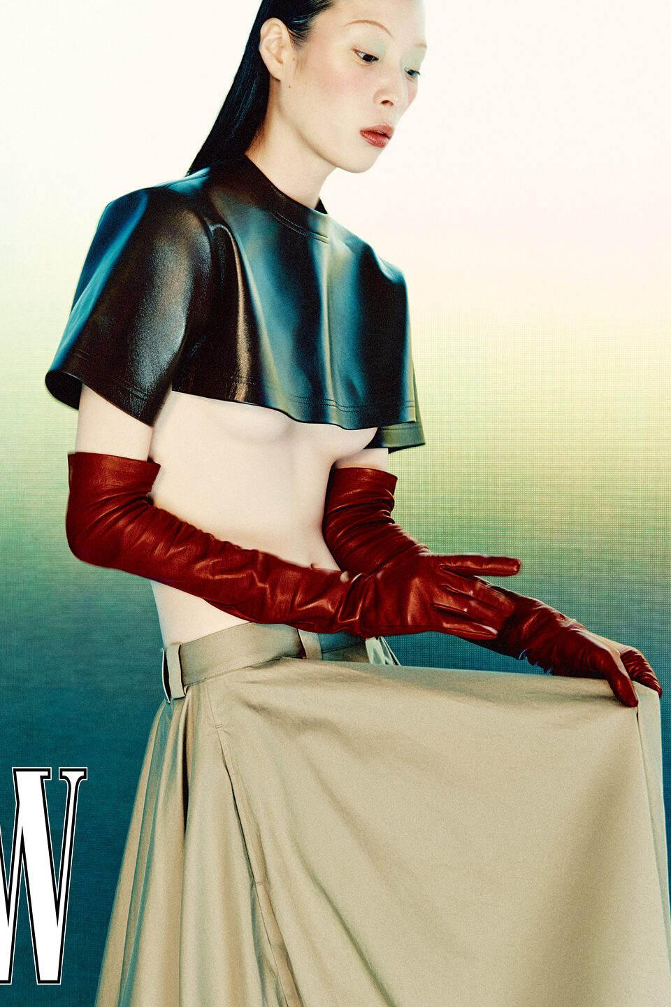 크롭트 가죽 톱, 롱 글러브, 벌룬 쇼츠는 발렌시아가 제품.