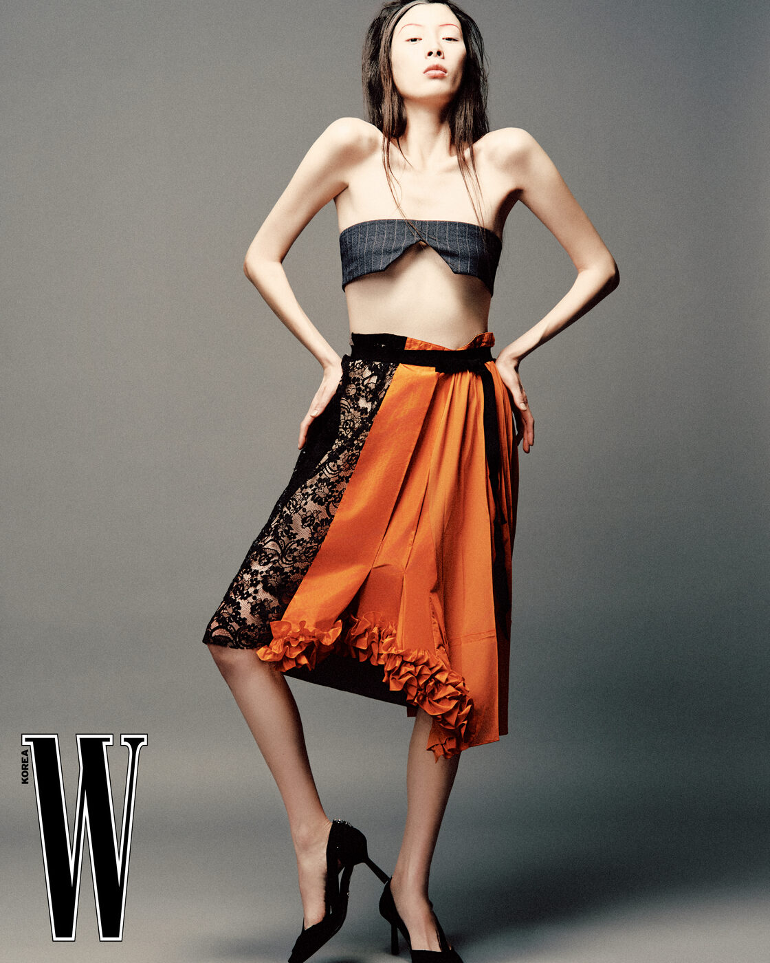 스트라이프 브라톱, 레이스 디테일 미디스커트, 펌프스는 프라다 제품.