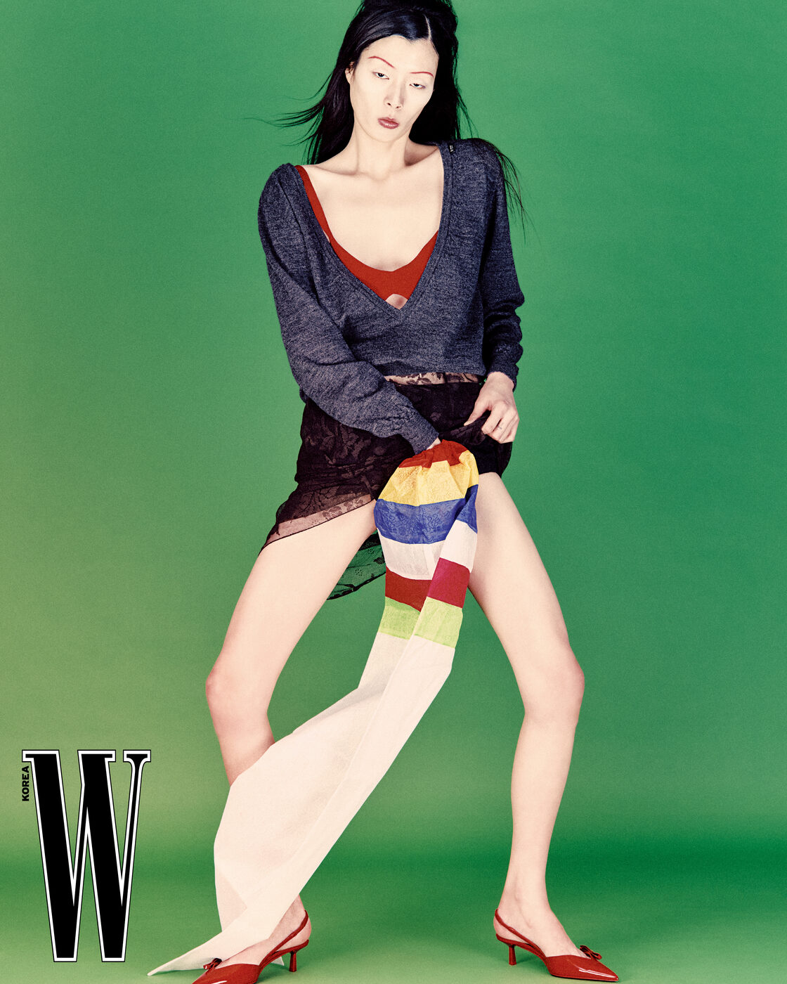 울 소재 니트 톱, 빨간색 브라톱, 브리프, 레이스 스커트, 슬링백은 프라다 제품.
