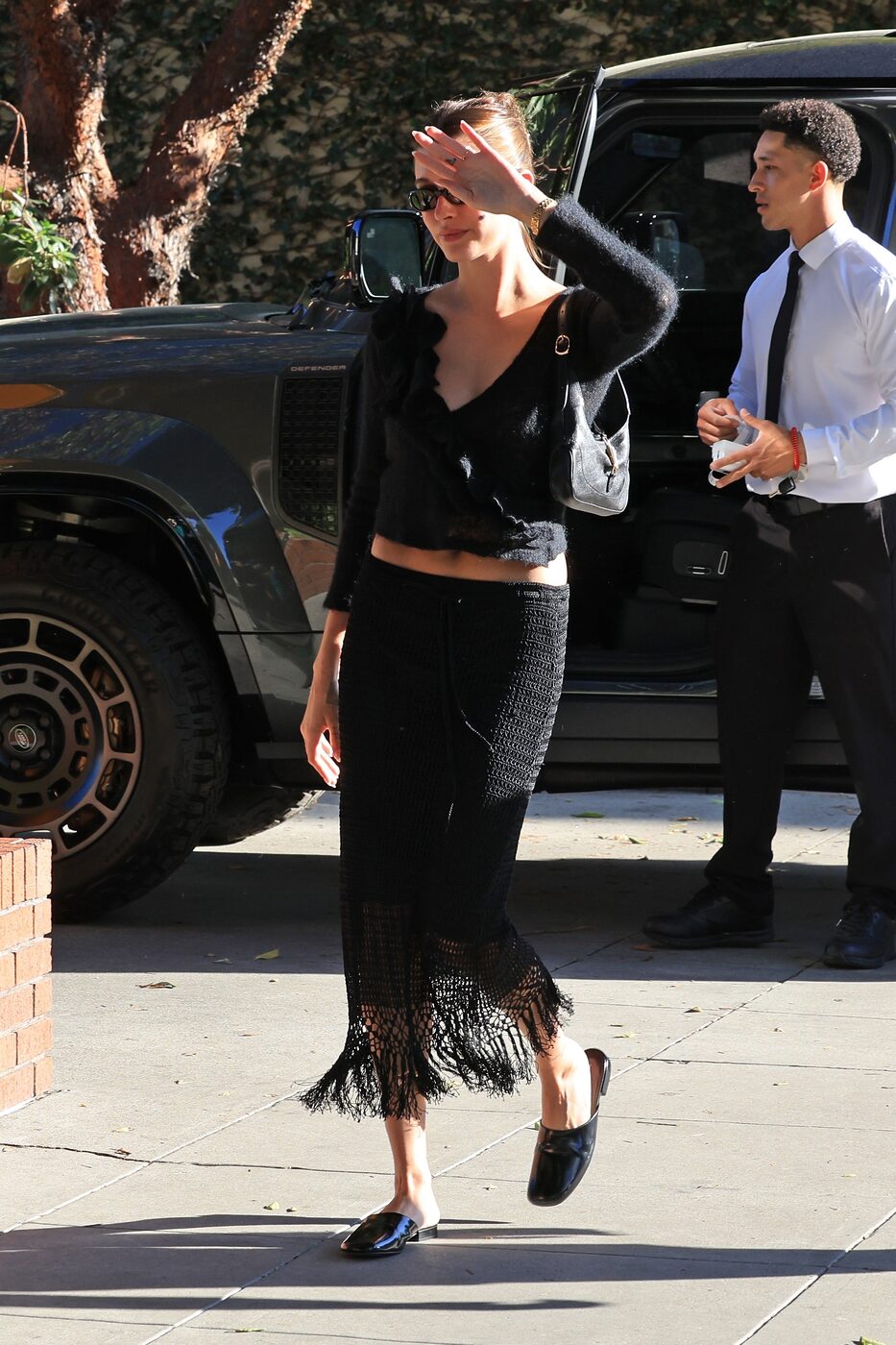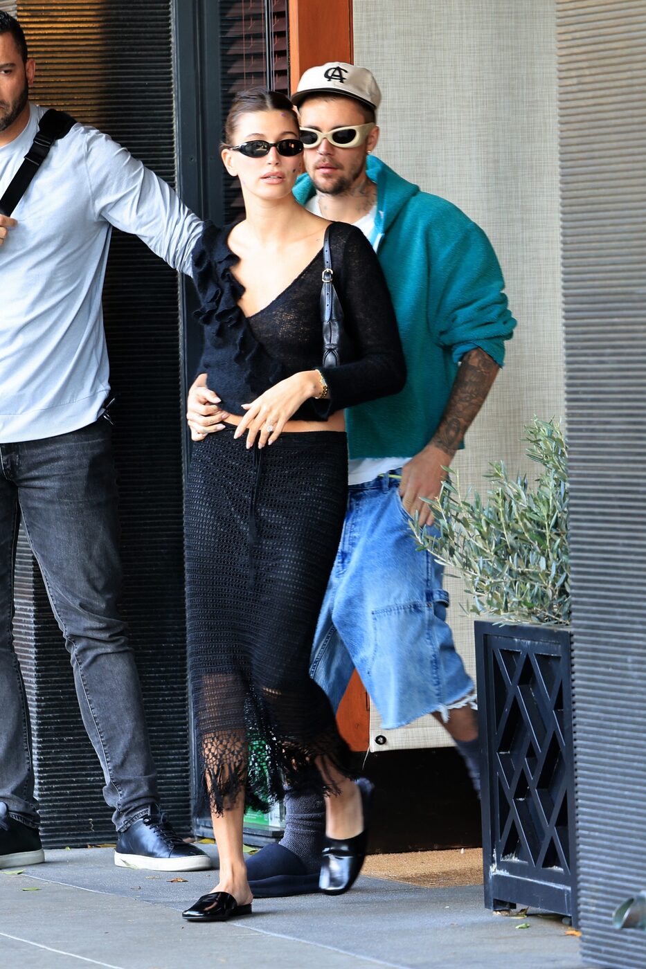 같은 미디 스커트지만 크로셰와 프린지 장식으로 보헤미안 무드를 풍긴 헤일리 비버입니다. 과감하게 파인 러플 장식의 블랙 니트 톱, 그리고 걸을 때마다 치렁치렁한 움직임의 크로셰 스커트가 마치 셋업 룩처럼 완벽한 합을 이뤘어요. 블랙의 시크함은 말할 것도 없죠. 미니멀한 디자인의 블랙 슬리퍼 슈즈와 백, 선글라스까지 올 블랙으로 입은 미세스 비버의 감각은 날이 갈수록 빛이 납니다. 그 뒤엔 여전히 꾸러기 무드의 데님 쇼츠를 입은 남편, 저스틴이 함께 했어요.