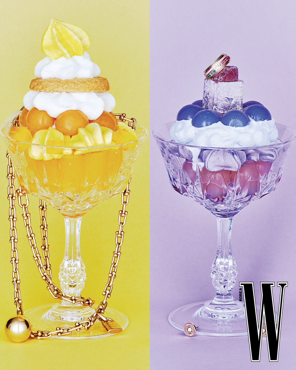 왼쪽부터 | 로즈 골드에 분리 가능한 볼과 락 장식을 세팅한 티파니 하드웨어 랩 네크리스는 Tiffany & Co. 제품. 로즈 골드에 다이아몬드, 다채로운 컬러 사파이어, 그린 차보라이트, 핑크 루비를 세팅한 포제션 링, 로즈 골드에 다이아몬드를 세팅한 포제션 이어링은 Piaget 제품.