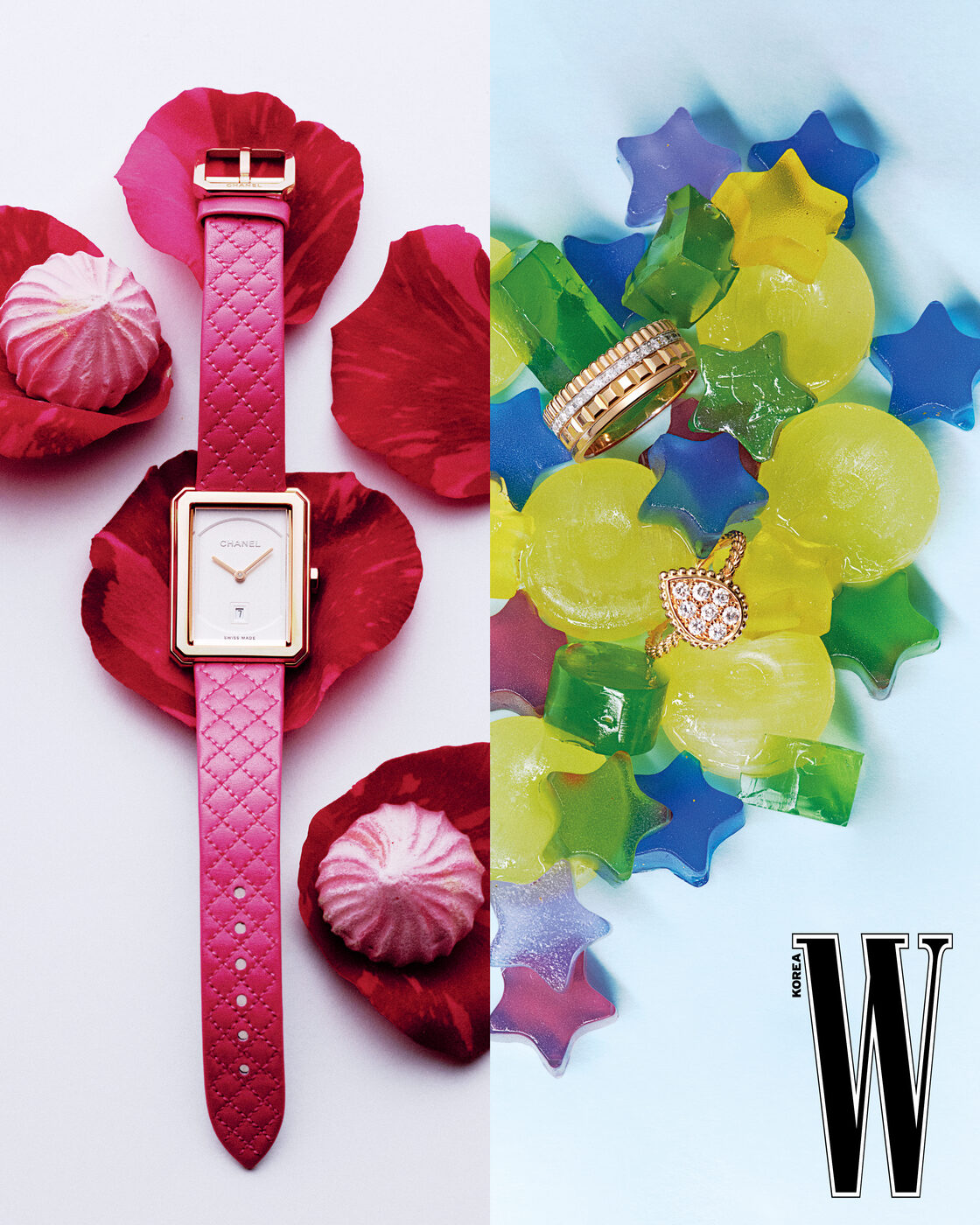 왼쪽부터 | 베이지 골드 케이스와 퀼팅 카프스킨 스트랩의 보이프렌드 워치는 Chanel Watches 제품. 핑크 골드에 다이아몬드를 세팅한 콰트로 레디언트 다이아몬드 스몰 링, 핑크 골드에 다이아몬드를 세팅한 쎄뻥 보헴 S 모티브 링은 Boucheron 제품.