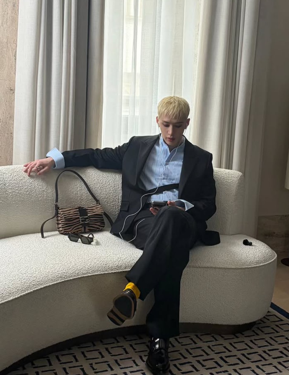필릭스의 경계를 넘는 스타일은 비단 쇼장만이 아닙니다. 파리로 향하는 공항, 그가 착용한 백은 주머니 형태의 디자인이 특징인 ‘노에’백. 마찬가지로 여성 백으로 하우스의 클래식한 아이콘 같은 백 중 하나입니다. 여기에 필릭스는 얇은 스카프, 키링을 더해 자신만의 스타일로 해석했네요.