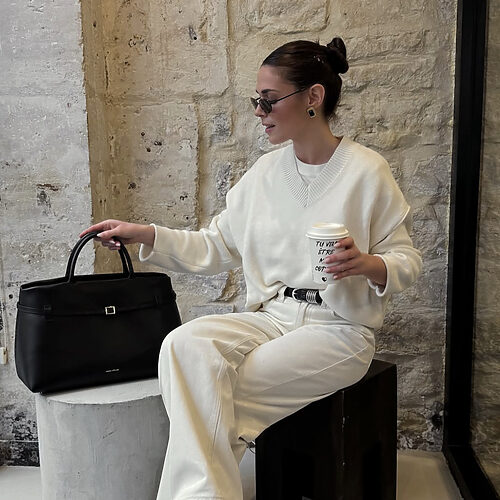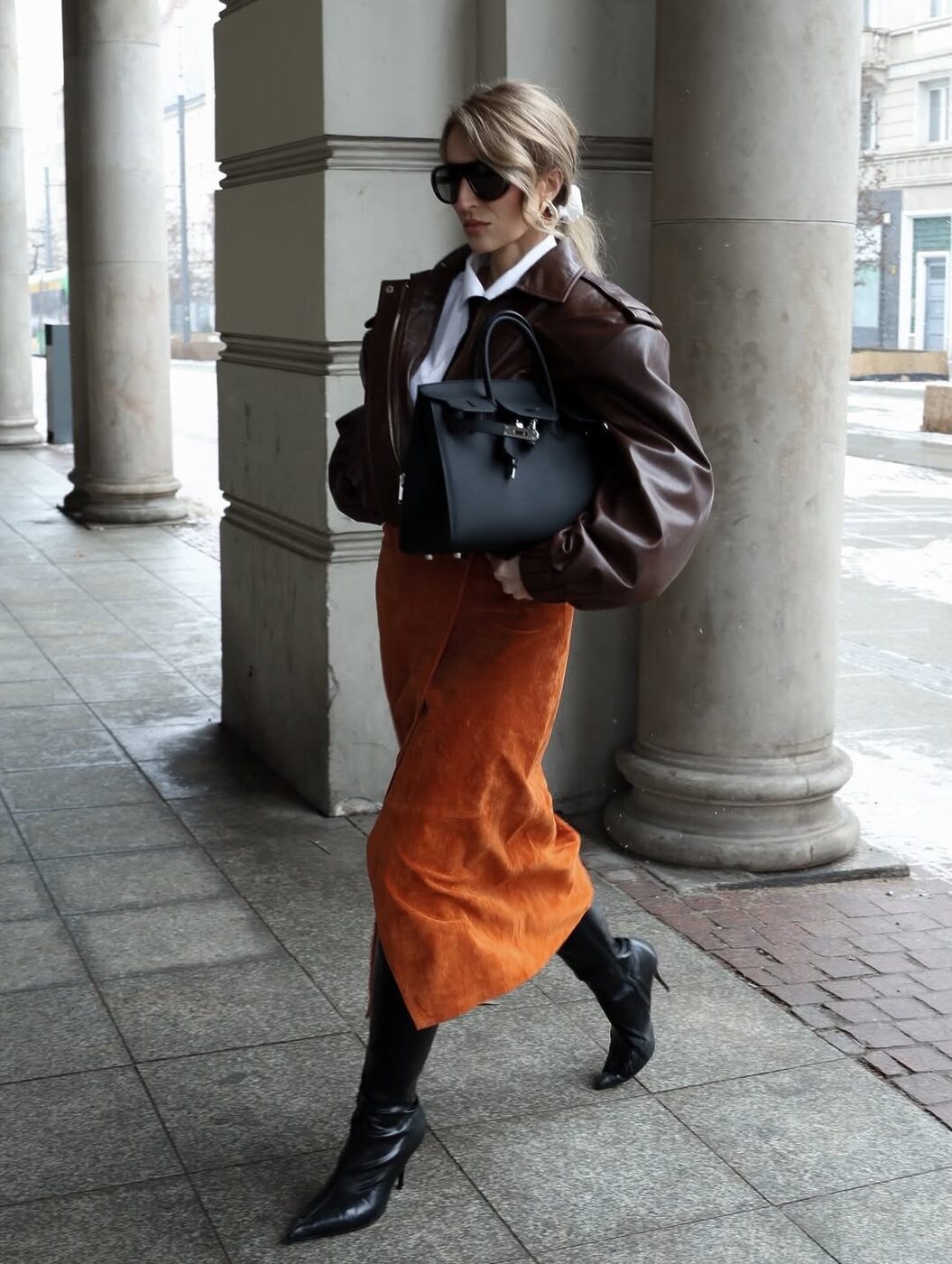 블랙 부츠는 날씨가 따뜻해지면 찾게 되는 컬러풀한 스커트에도 매치하기 좋죠. 다만 스커트 외의 아이템들은 스커트와 비슷한 계열이되 너무 튀지 않는 컬러로 고르는 것이 중요해요. 여기에 날렵한 쉐입의 부츠와 포멀한 백이라면 오피스 룩으로 제격이죠. 산뜻하면서도 무게감을 잃지 않는 룩이 될 거에요.