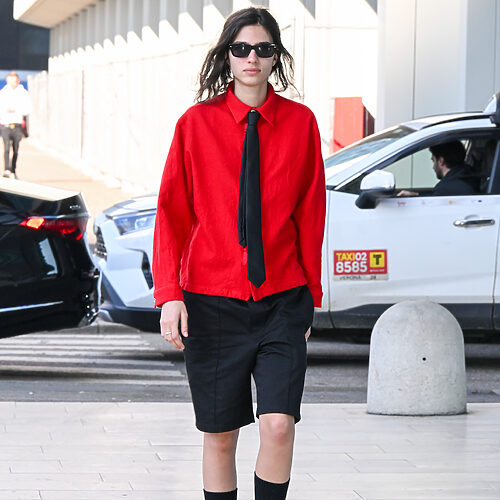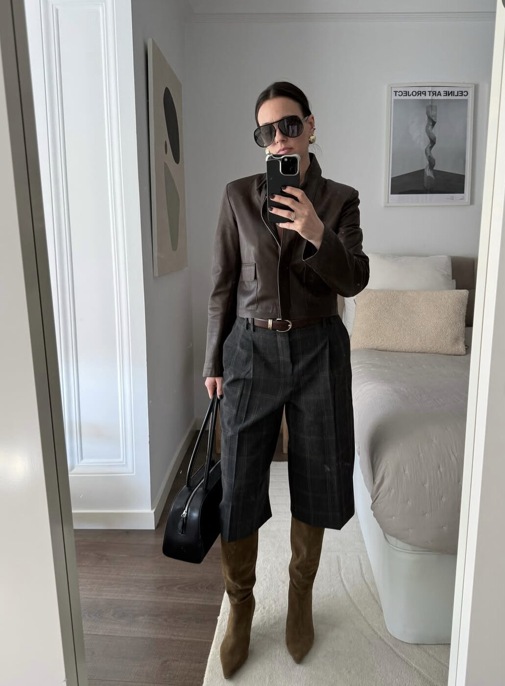 이 포멀한 반바지는 부츠와도 우아하게 어울립니다. 슬림한 롱 부츠에 클래식한 디테일이 살아있는 슈트 형식의 쇼츠와 숏 레저 재킷의 조합에서 빈틈없는 격식이 느껴져요. 남성스러움과 동시에 더 매력적이고 섹시한 스타일이 연출되었죠.