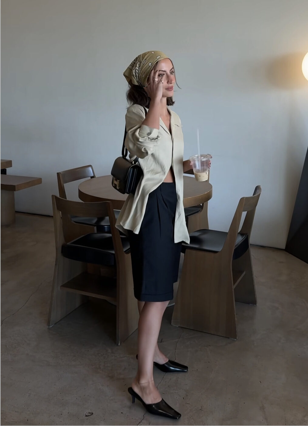 가장 부담 없이 입을 수 있는 미니멀한 디자인의 블랙 쇼츠. 딱 무릎 길이에 슬렉스 정도의 적당한 폭이 가장 시크해 보입니다. 그 위엔 셔츠만 툭 걸쳐도 멋스럽게 느껴져요. 매니시함이 풀풀 나는 룩에는 블랙의 심플한 뮬 힐을 신어 여성스러움을 더했어요.