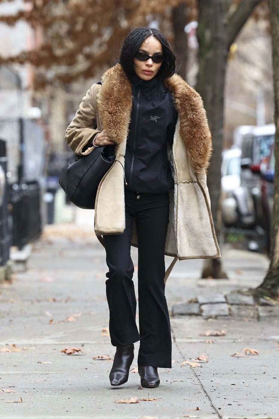 진정한 패셔니스타는 장르를 가리지 않는 법이죠. 조 크라비츠는 믹스매치의 장인이기도 합니다. 전날 입었던 플레어 팬츠와 백을 다시 한번 활용했는데요. 앞서는 트렌치 코트로 포멀한 분위기를 연출했다면 이번에는 한층 캐주얼한 접근이었죠. 아크테릭스의 트랙 재킷에 퍼가 트리밍된 브라운 하프 코트를 레이어드해 서로 다른 무드의 아이템을 과감하게 조합했습니다. 아웃도어와 클래식 아우터를 조합했지만 특유의 담백한 스타일링 덕분에 전혀 어색하지 않았죠.