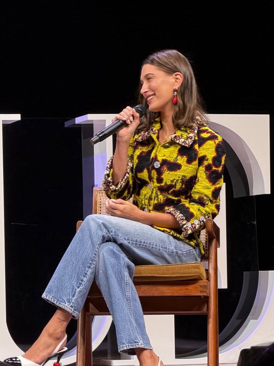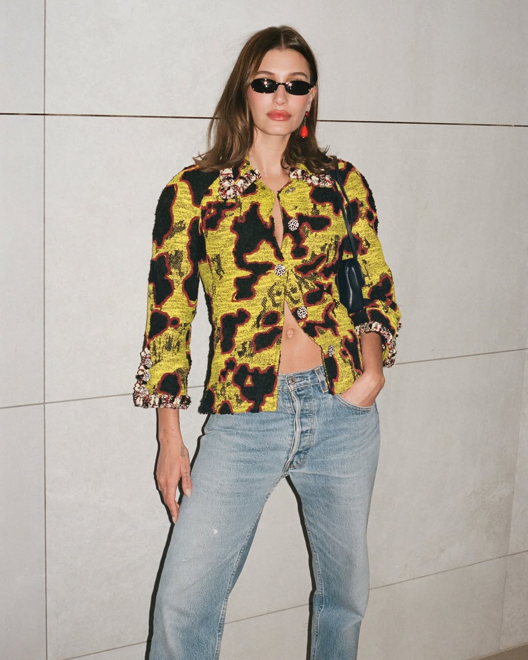이번엔 한층 과감한 디자인을 활용한 스타일을 볼 차례입니다. 한 오픈 토크 행사에서 포멀한 재킷 룩을 입고 등장한 헤일리 비버. 지난 12월, 뉴욕 보워리 지하철역 플랫폼에서 열린 샤넬 공방 컬렉션에서는 이 화려한 패턴을 셋업으로 선보인 바 있습니다. 불규칙한 패턴과 화려한 네온 컬러 대비가 압도적인 룩이었죠. 반면 헤일리는 좀 더 데일리하게 활용했습니다. 애착템 빈티지 501 리바이스 데님을 매치해 공방의 우아함은 살리되 헤일리 본연의 색을 잃지 않았죠. 여기에 전에 착용했던 슈즈와 백, 그리고 빨간 드롭 이어링까지 모두 샤넬로 통일해 화사한 아웃핏을 완성했습니다. 하우스의 아이코닉한 감성을 그녀의 방식대로 자연스럽게 녹여내는 모습을 엿볼 수 있었죠.
