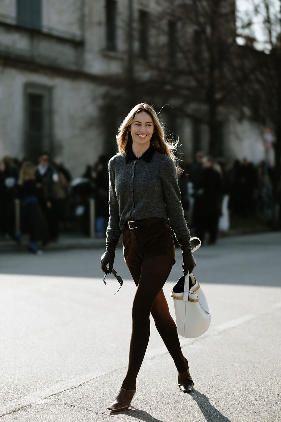 적나라하게 맨다리를 드러내는 것이 부담스럽다면 살을 가리는 스타킹이 좋은 해결책이 됩니다. 다만 쇼츠와 스타킹의 컬러가 너무 다르면 오점이 되니 슈즈까지 같은 컬러로 통일해 아찔한 실루엣을 완성하는거죠. 장갑으로 손 끝까지 가렸지만 시원하게 뻗은 실루엣 덕분에 전혀 답답해 보이지 않아요.