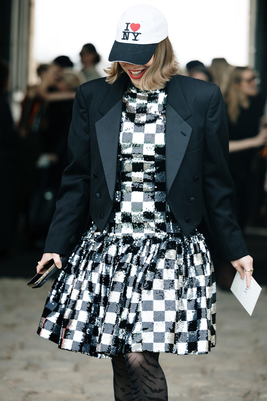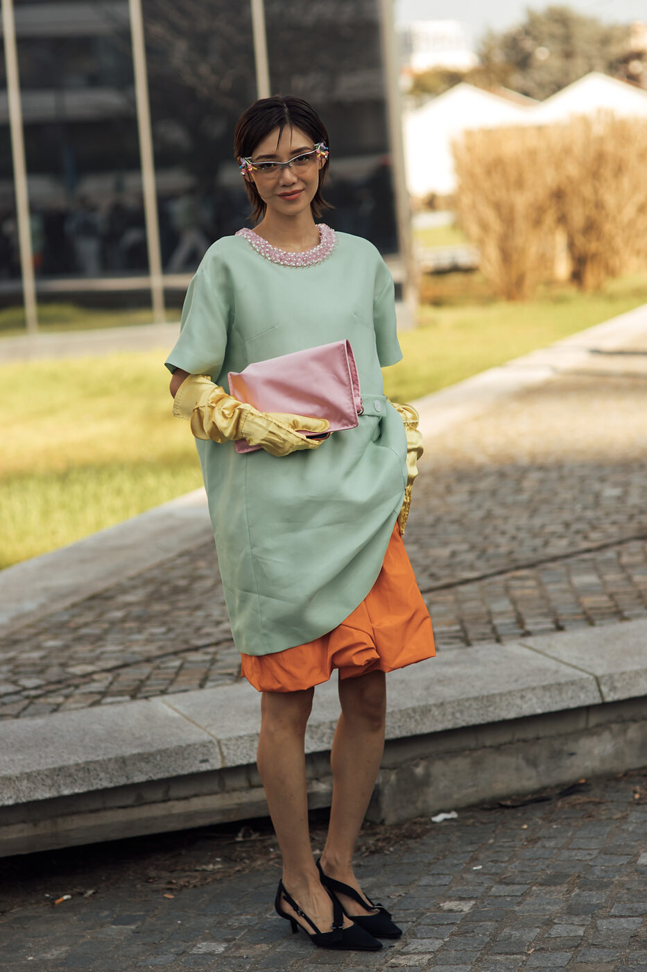 무릎 위까지 올라오는 길이의 미니 드레스와 태피터 스커트의 조합이라니요. 평소라면 절대 시도하지 못했을 레이어드지만 약간의 용기만 더하면 충분히 소화 가능합니다. 대신 비율 싸움에서 승기를 가져가려면 드레스 밑단 한쪽을 슬쩍 끌어올려 허리 선의 시작점을 귀띔해 주는 것이 좋겠죠.