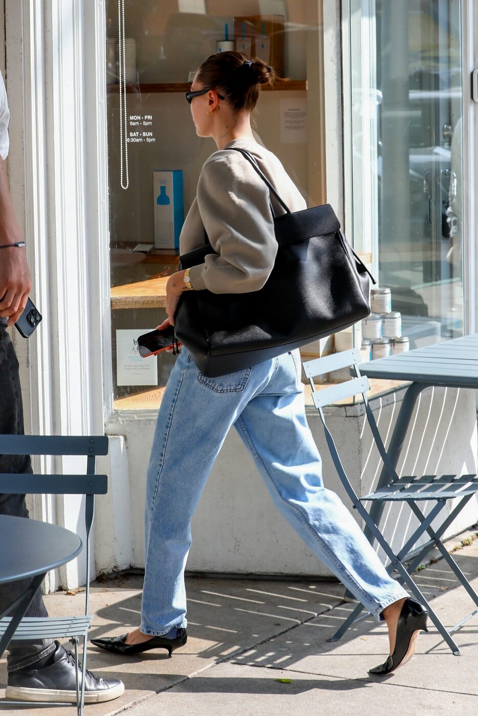 얼마전 따스한 봄 햇살 아래 헤일리 비버 역시 세련된 데이웨어에 이 커다란 백을 매치했습니다. 당장 따라 입고 싶은 스타일리시한 에포리스 룩이었어요. 베이지톤의 스웻셔츠에 연한 청바지를 입고 키튼힐을 신은 룩에 든 이 커다란 블랙 가방이 세련된 존재감을 드러냈죠.