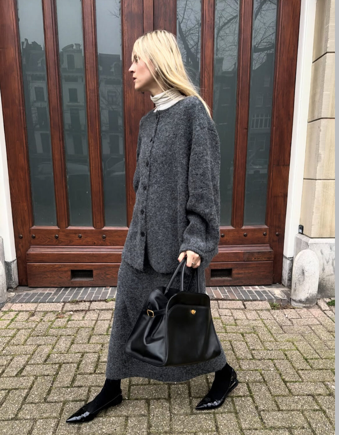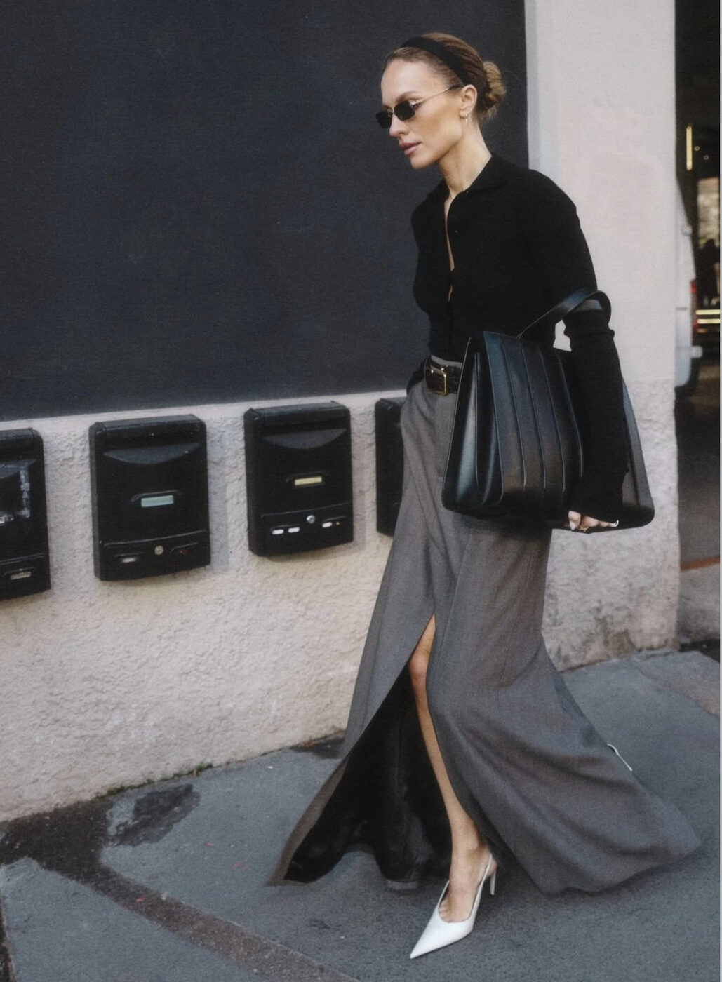 가방의 크기 때문일까요, 유독 맥시 사이즈 아이템과 잘 어울리는 까만 보부상 가방은 미디 혹은 맥시 스커트에도 포인트로 제격이에요. 가방의 디자인과 소재에 따라 딱딱한 소재의 형태감이 살아있는 백이라면 포멀한 무드를, 부드러운 가죽 소재의 유연한 실루엣의 백이라면 니트 소재의 옷차림과 한층 더 캐주얼한 무드로 소화하기 적당합니다.