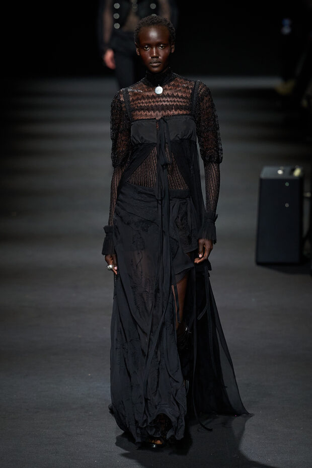 다크하고 그로테스크한 앤 드뮐미스터의 런웨이에서 블랙 레이스는 빠지지 않는 단골 소재입니다. 앞서 본 아멜리아 그레이의 레이스 톱 역시 앤 드뮐미스터의 제품이었고요. 앤 드뮐미스터는 레이스의 로맨틱함을 강조하기 보다는 시크한 분위기에 포커스를 두었습니다. 미니멀한 실루엣과 블랙 컬러가 주는 드레시하고 고급스러운 느낌도 매력적이죠.