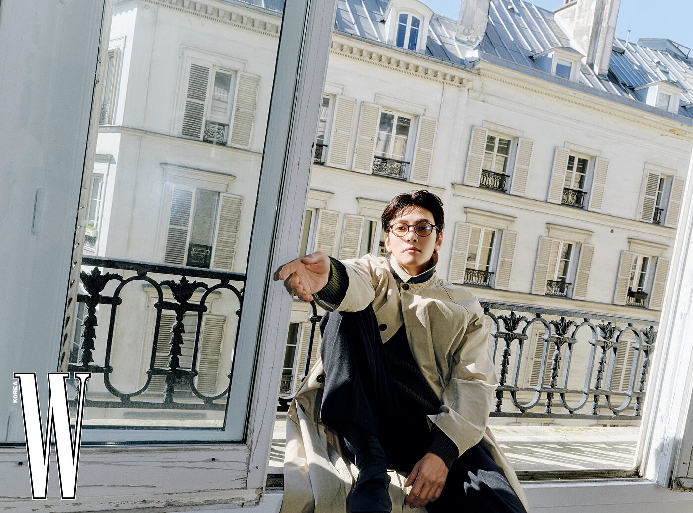 클래식한 판토스 프레임에 아이코닉한 T 로고 디테일을 더한 안경은 Tom Ford Eyewear by Marcolin 제품. 다크 샴페인 컬러의 코튼 실크 개버딘 레인코트, 올리브색 크루넥 니트, 더블 플리츠 블랙 팬츠와 슈즈는 Tom Ford 제품.