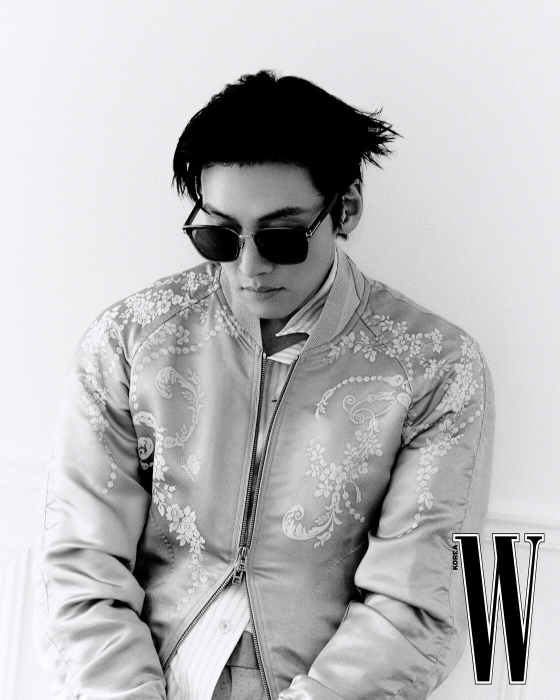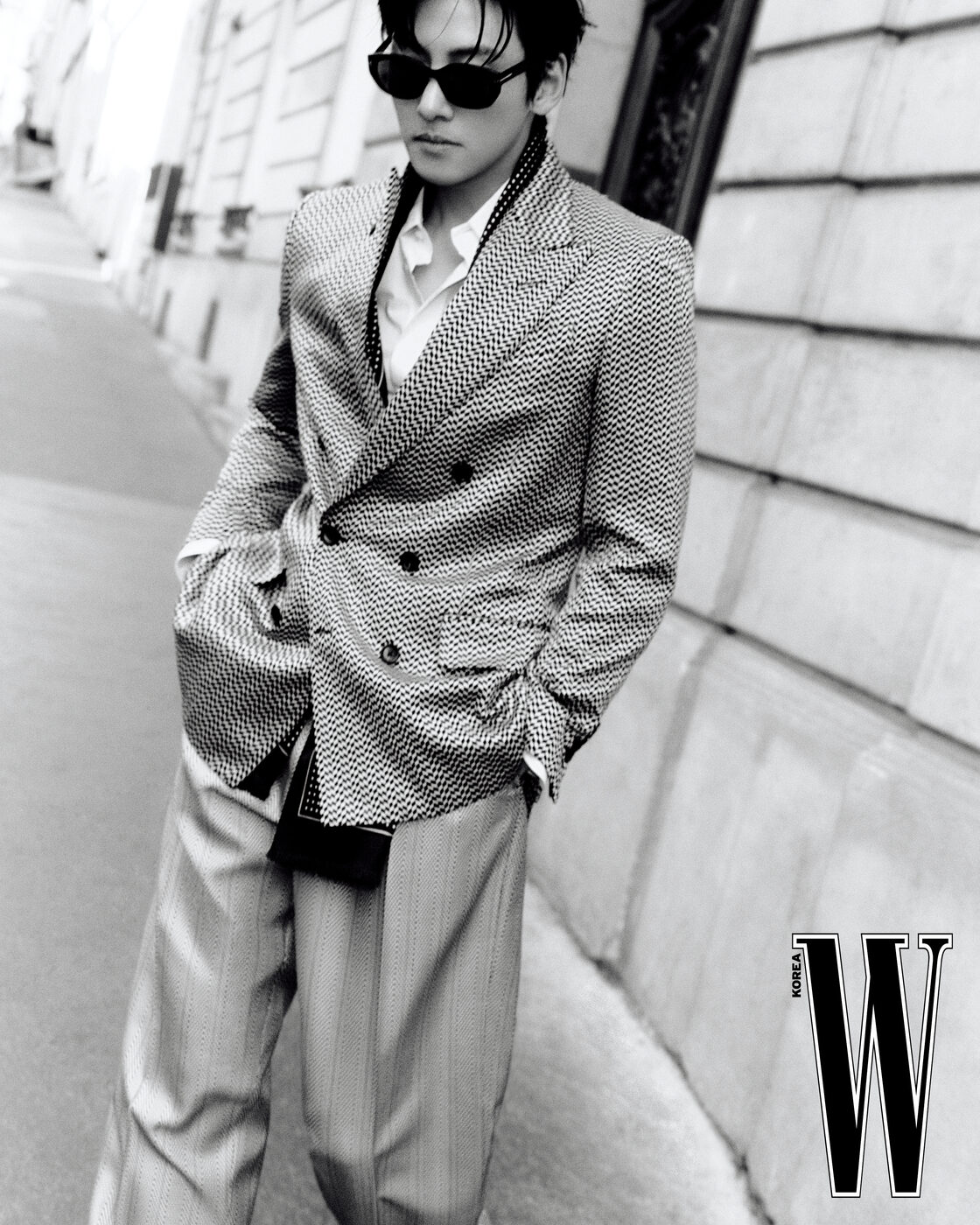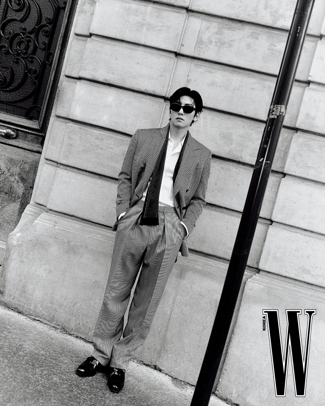입체적인 각을 살린 나비 모양 아세테이트 프레임, 기하학적 디자인이 특징인 선글라스는 Tom Ford Eyewear by Marcolin 제품. 실크 자카드 재킷과 팬츠, 타공 디테일 화이트 셔츠, 도트 무늬 실크 스카프, 슈즈는 Tom Ford 제품.