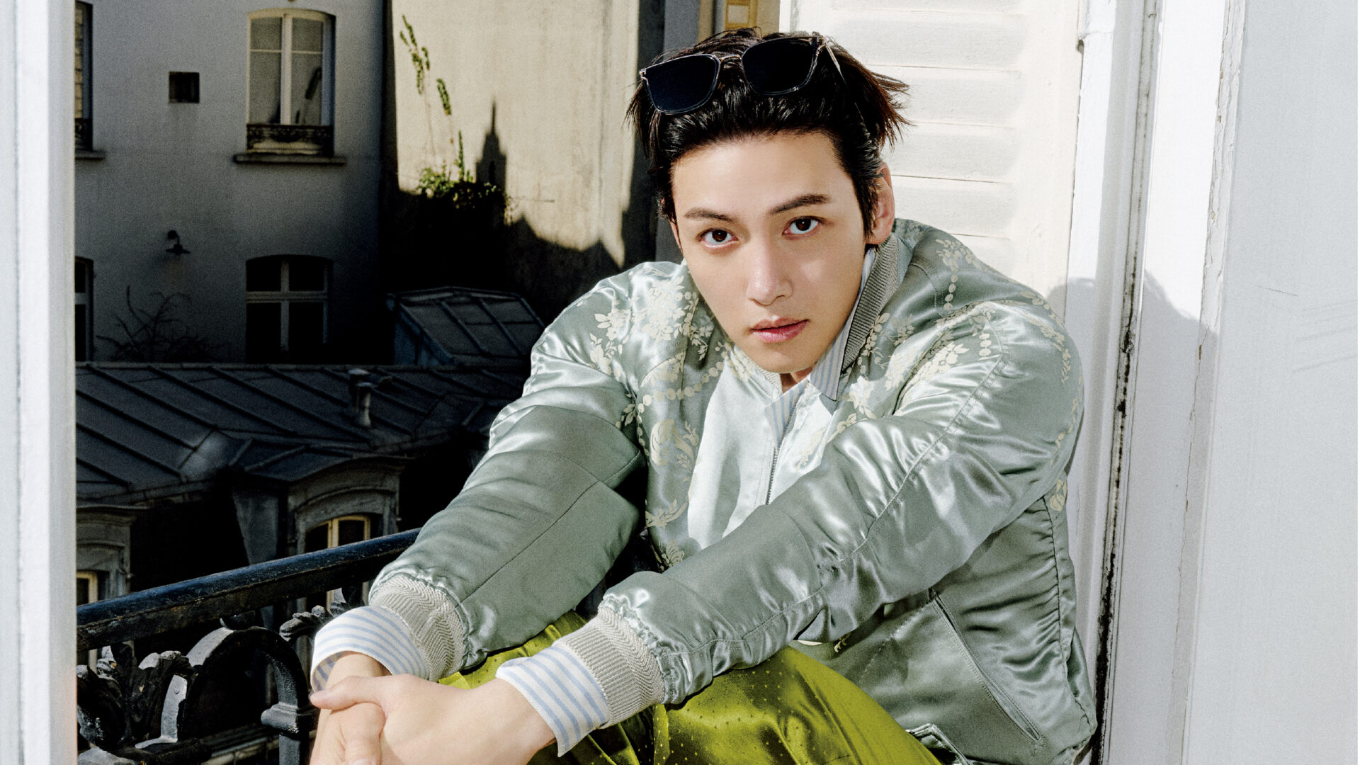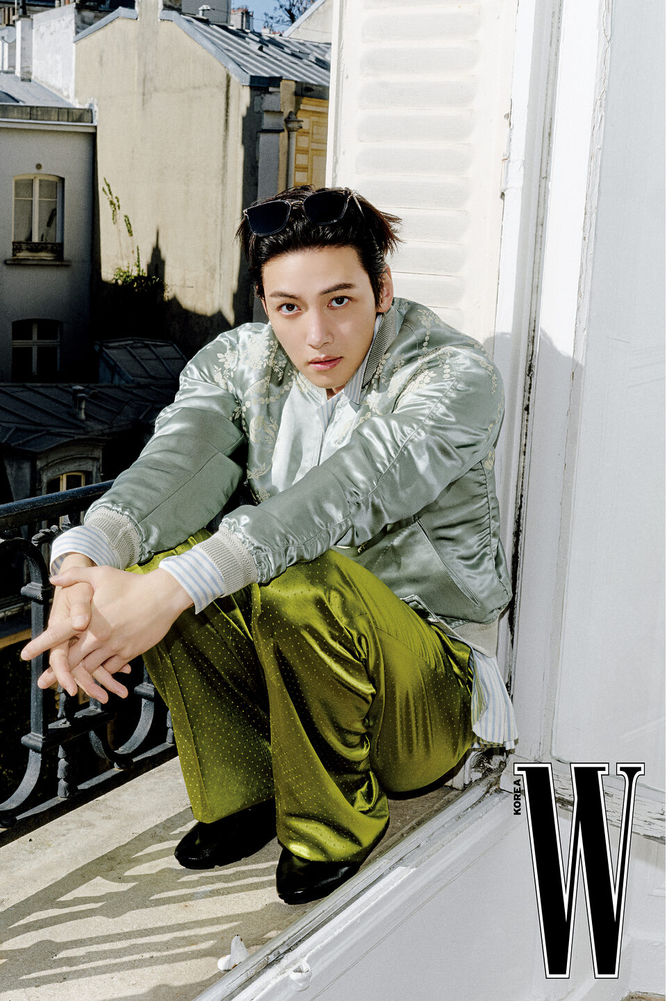 정교한 아세테이트 프레임에 메탈 장식과 조절 가능한 노즈 패드, 아이코닉한 T 로고를 더한 선글라스는 Tom Ford Eyewear by Marcolin. 녹색 실크 자카드 보머 재킷, 줄무늬 실크 셔츠, 연두색 테일러링 팬츠, 검정 발레 슈즈는 Tom Ford 제품.