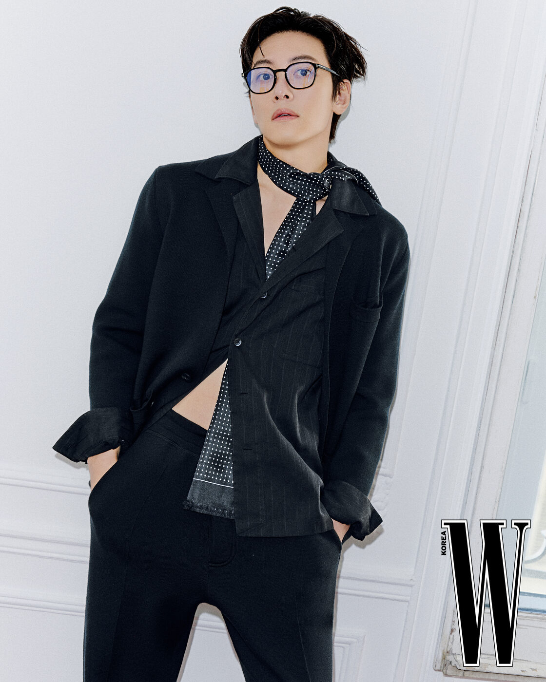 얇은 안경테와 조절 가능한 코받침, 메탈 T 로고와 청색광 차단 렌즈를 더한 안경은 Tom Ford Eyewear by Marcolin 제품. 건축적인 디자인의 울 니트 재킷과 조거 팬츠, 검정 도트 무늬 실크 스카프는 Tom Ford 제품.