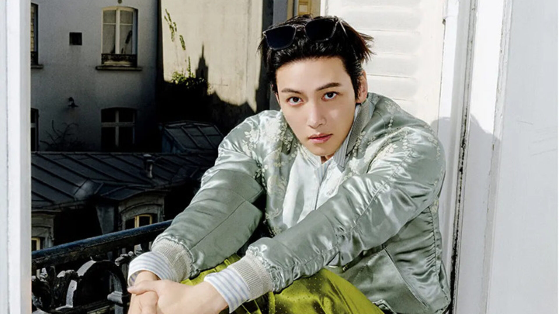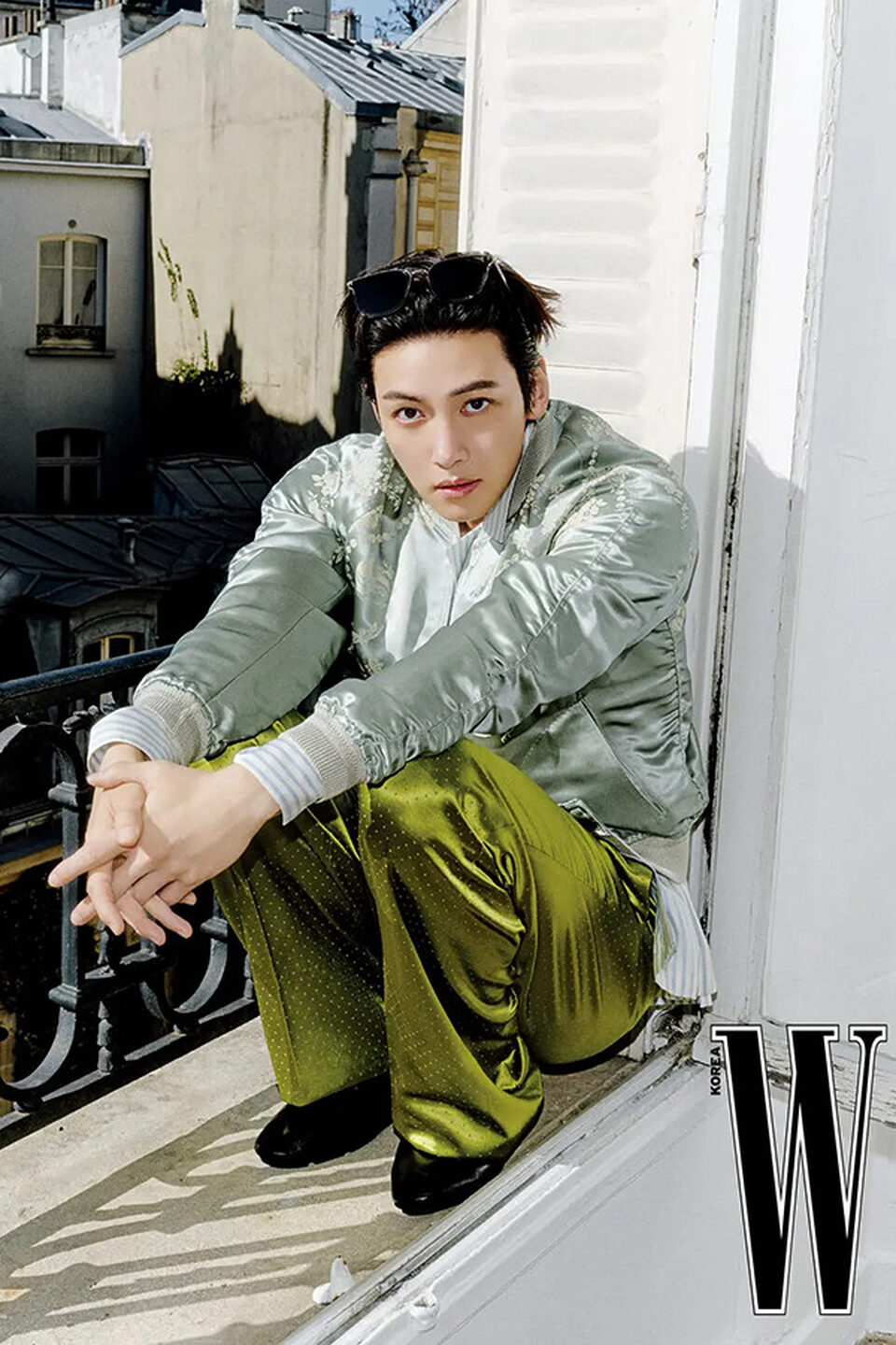 정교한 아세테이트 프레임에 메탈 장식과 조절 가능한 노즈 패드, 아이코닉한 T 로고를 더한 선글라스는 Tom Ford Eyewear by Marcolin. 녹색 실크 자카드 보머 재킷, 줄무늬 실크 셔츠, 연두색 테일러링 팬츠, 검정 발레 슈즈는 Tom Ford 제품.