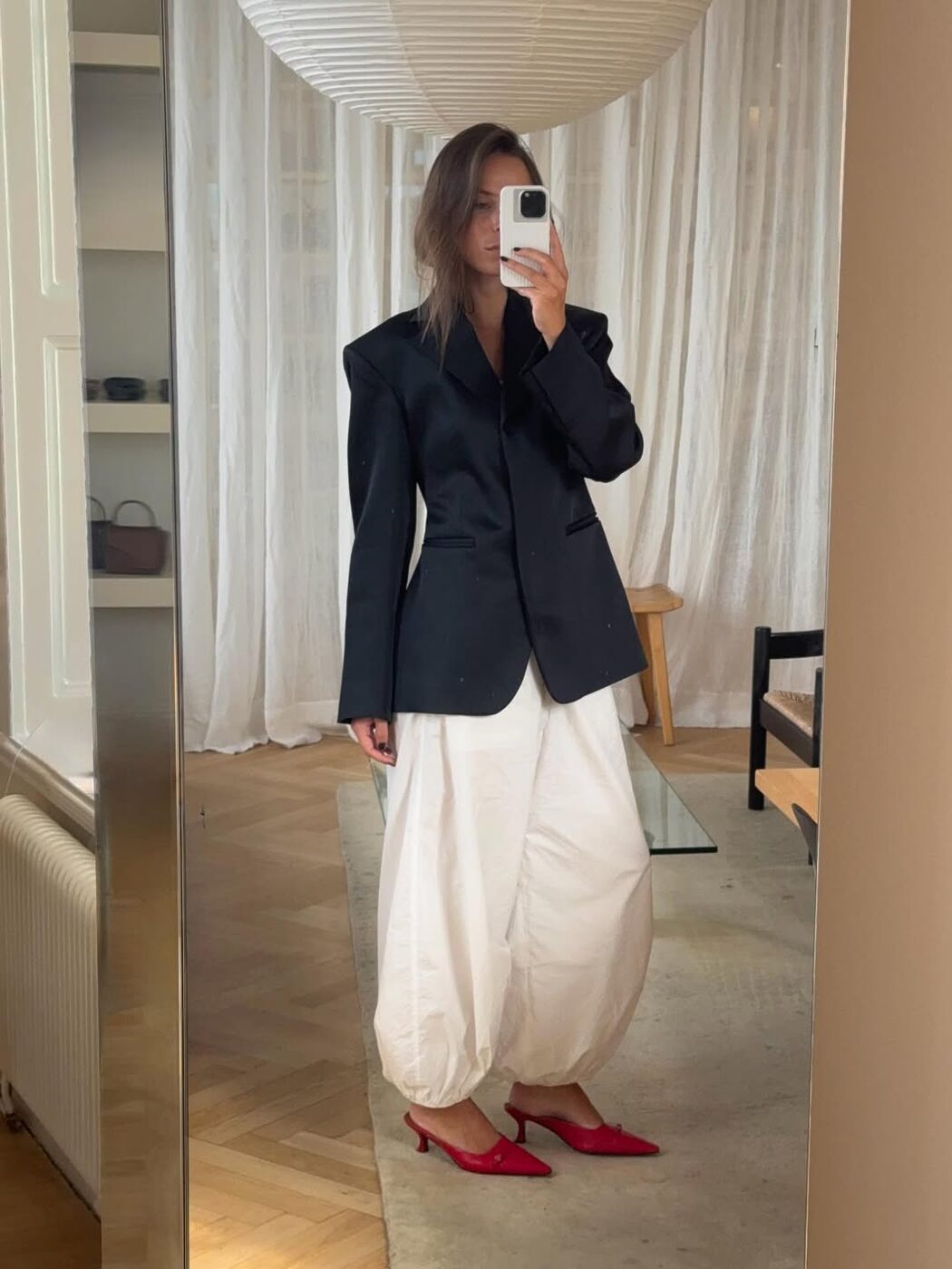 지나치게 부담스럽지 않으면서 적당히 포인트가 될 만큼의 요소를 갖춘 팬츠를 찾는다면 맥시멀한 디테일에 주목하세요. 바닥에 질질 끌릴 듯한 기다란 길이, 허리도 들어갈 법한 넉넉한 너비의 팬츠는 하나만으로도 룩 전체에 여유로운 분위기가 감돌게 해주거든요. 대신 매치할 아이템의 컬러, 패턴 등은 최대한 덜어내거나 무난한 것으로 골라야 팬츠의 ‘맥시멀한 맛’이 제대로 살아난다는 점을 잊지 마세요.
