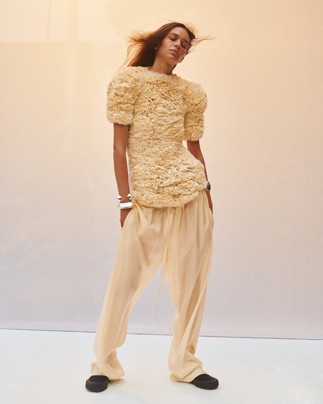 프레젠테이션 전반에 걸쳐 드러나는 것은 상반된 코드들의 공존이다. 시어링의 풍성함과 유니폼의 긴장, 파자마의 이완, 란제리의 섬세함. 이 모든 요소는 충돌하지 않고 오히려 서로를 더 선명하게 만든다. 여성은 하나의 이미지로 고정되지 않고, 그 사이를 유연하게 이동한다. 그리고 그 이동 자체가 스타일이 된다.