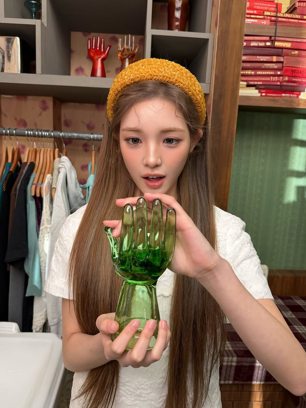 하츠투하츠 유하는 니팅 기법이 더해진 머리띠를 선택했습니다. 볼륨감이 확실하게 살아 있는 노란 헤어밴드가 러블리하고 걸리시한 무드를 더해주죠. 가르마는 살려서 깔끔하게 뒷머리를 정돈해주고, 앞머리에는 가닥 가닥 컬을 넣어서 포인트를 준 디테일도 참고할 만한 팁.