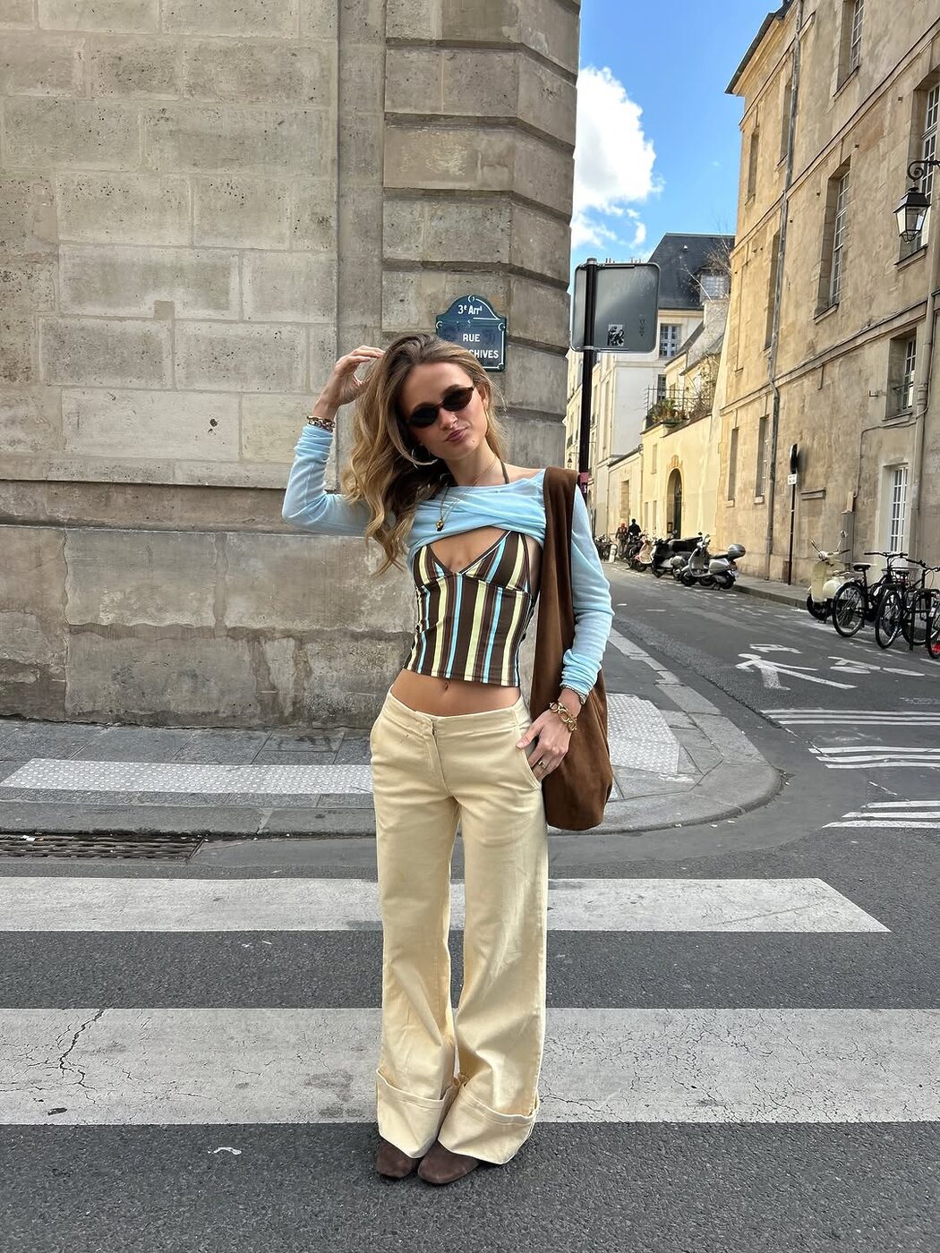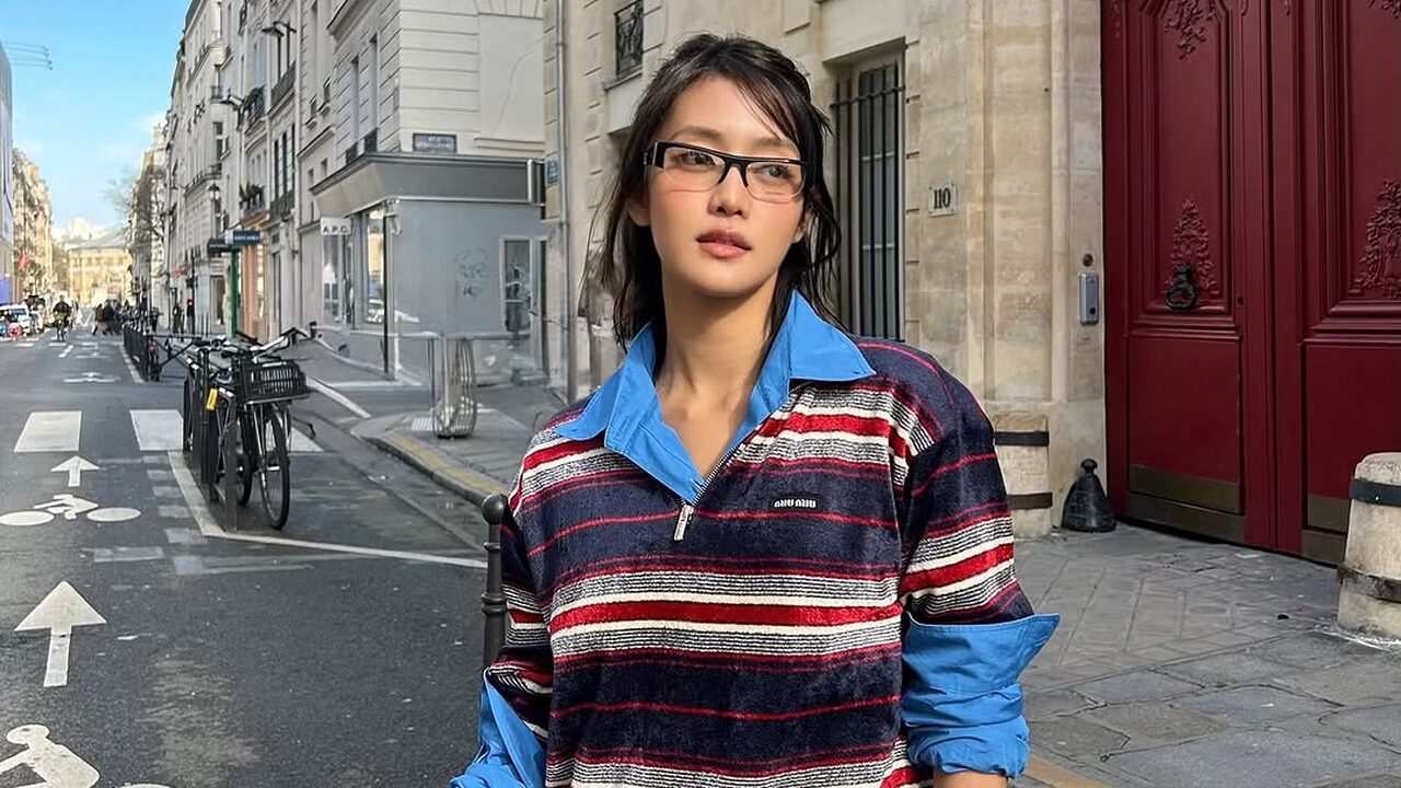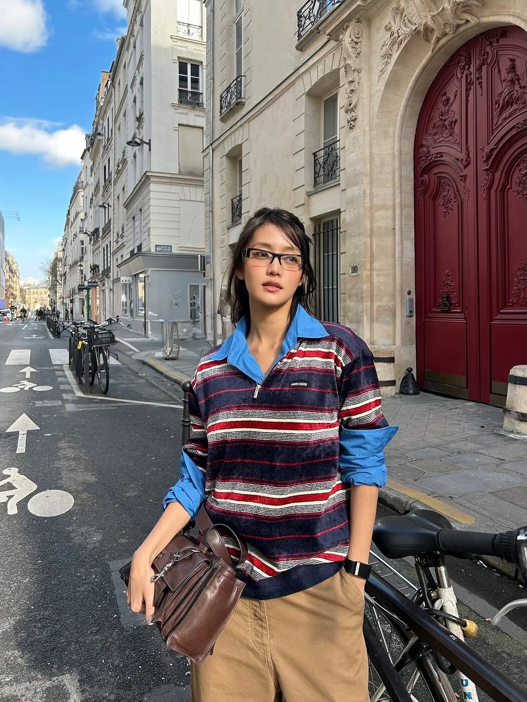 스트라이프 톱을 단독으로 강조하기보다 레이어드를 적극 활용한 민니. 쨍한 블루 셔츠를 레이어드 해서 스트라이프의 경쾌함을 살짝 눌러줬죠. 상의에 이미 컬러가 충분히 들어가 있는 만큼 하의는 베이지 팬츠로 차분하게 균형을 맞췄습니다. 여기에 무심하게 걷어 올린 소매와 괴짜스럽고도 지적인 무드를 더하는 안경으로 개성 넘치는 룩을 완성했네요.