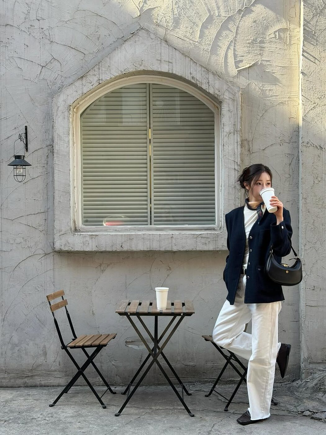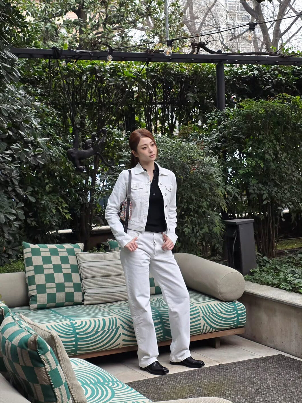 스트레이트 핏 화이트 데님 팬츠는 클린한 매력을 살리면 아주 잘 차려입은 듯한 인상을 주죠. 상하의 모두 화이트 컬러로 통일한 모노크롬 룩은 고도의 스타일링 기술을 더하지 않아도 완성도 높은 룩으로 만들어 줄 겁니다. 허윤진처럼 화이트 데님 재킷을 셋업으로 입으면 격식을 갖춘 듯 포멀하면서도 모던한 분위기를, 김나영과 같이 미묘한 톤 차이가 있는 트렌치코트와 매치하면 부드럽고 우아한 무드를 완성할 수 있어요.