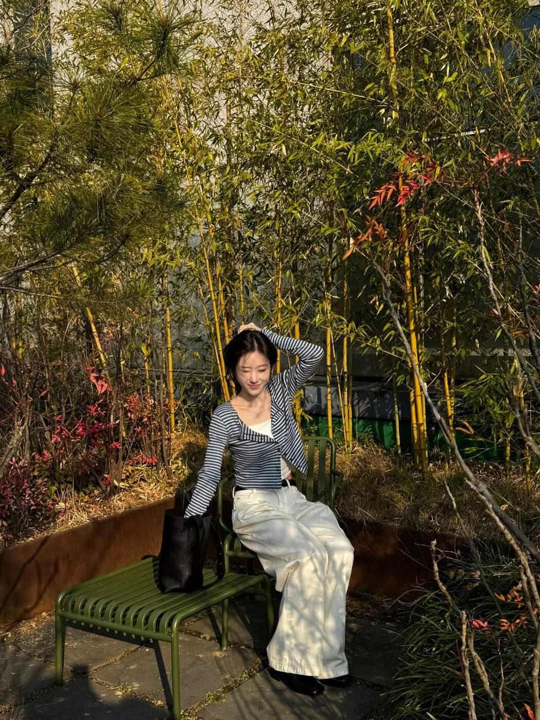 채령은 화이트 데님 팬츠와 찰떡궁합인 스트라이프 패턴을 매치해 청량한 분위기의 마린 룩을 선보였어요. 와이드한 루스 핏 팬츠로 쿨한 인상을 주면서 짧은 길이의 상의와 벨트를 활용해 날씬한 허리 라인을 강조하는 것도 잊지 않았죠. 꾸미지 않은 듯 자연스럽고 편안한 룩인데 상큼함과 멋이 동시에 느껴집니다.