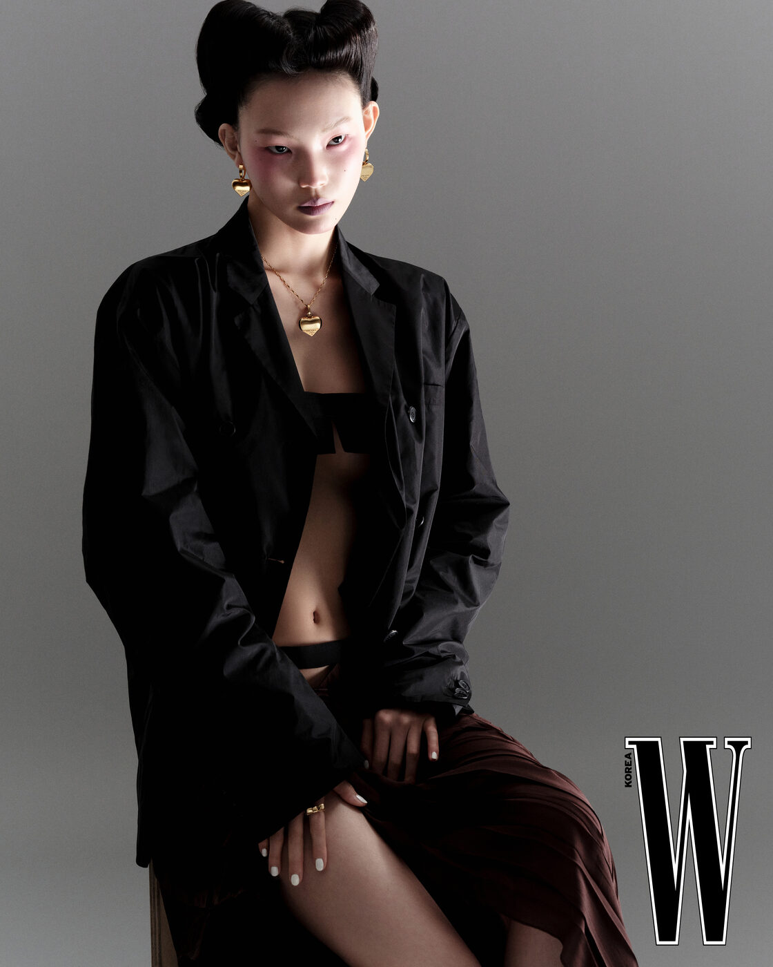 이어링, 코트는 Saint Laurent by Anthony Vaccarello 제품
