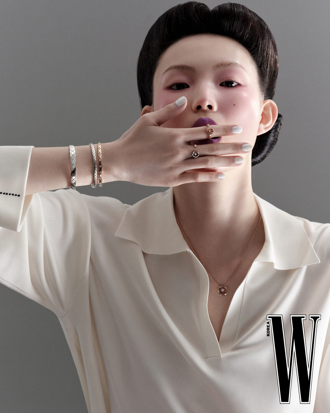 코코 크러쉬 브레이슬릿, 코코 크러쉬 링, 코코 크러쉬 네크리스는 CHANEL Fine Jewelry, 실크 풀오버는 Chanel 제품.