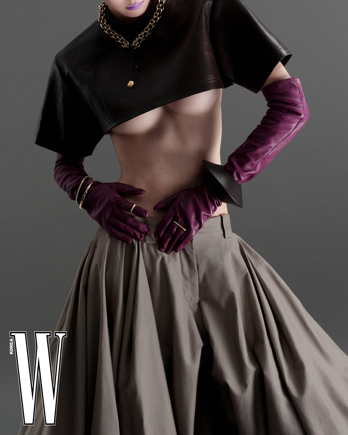 티파니 락 뱅글, 티파니 락 링, 티파니 락 투 핑거 링은 Tiffany & Co., 네크리스, 브레이슬릿은 Ferragamo, 슈퍼 크롭트 티셔츠, 벌룬 쇼츠, 장갑은 Balenciaga 제품.