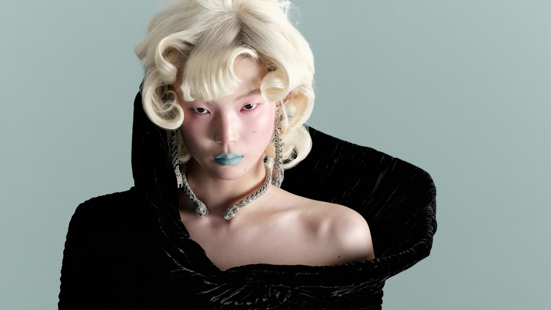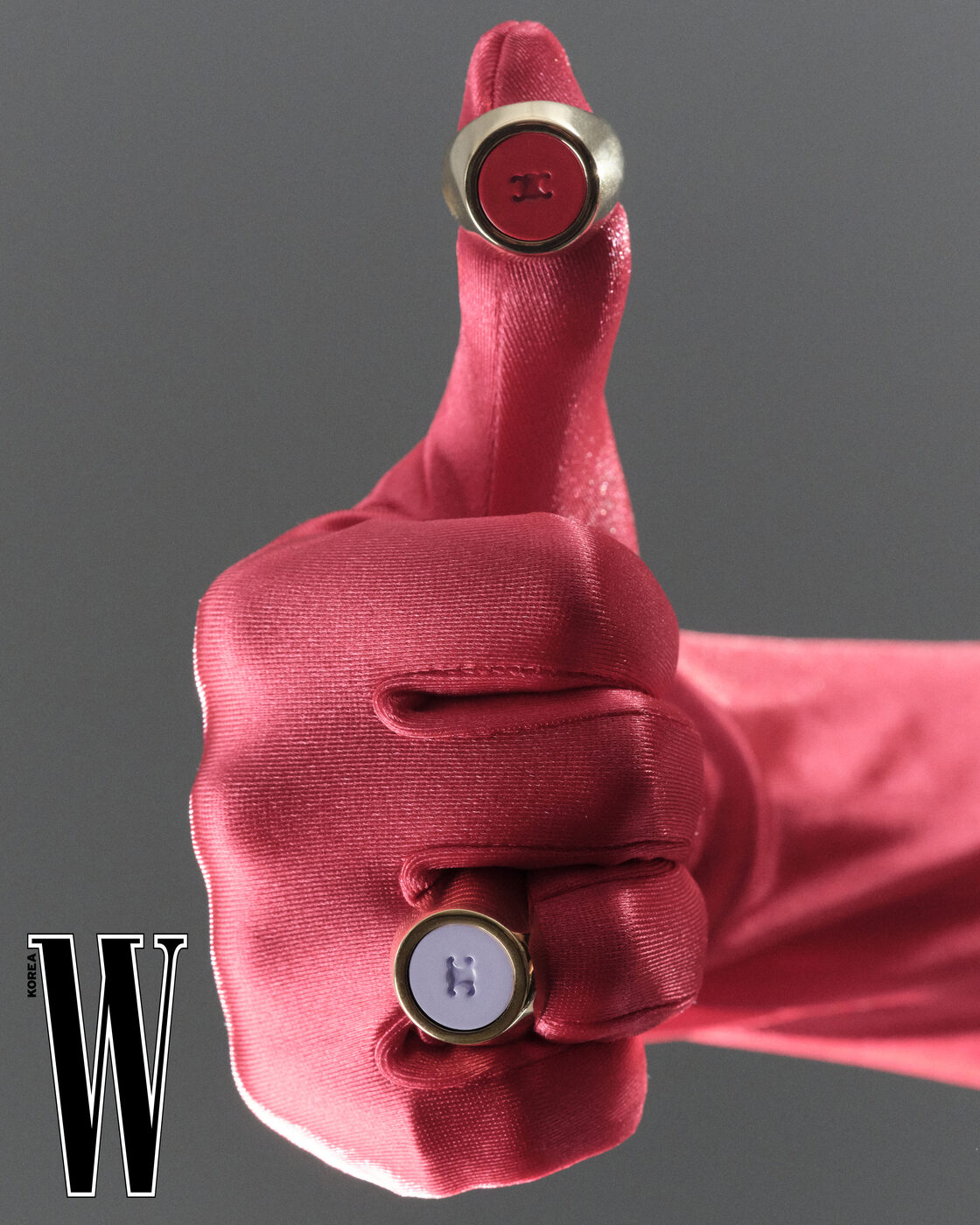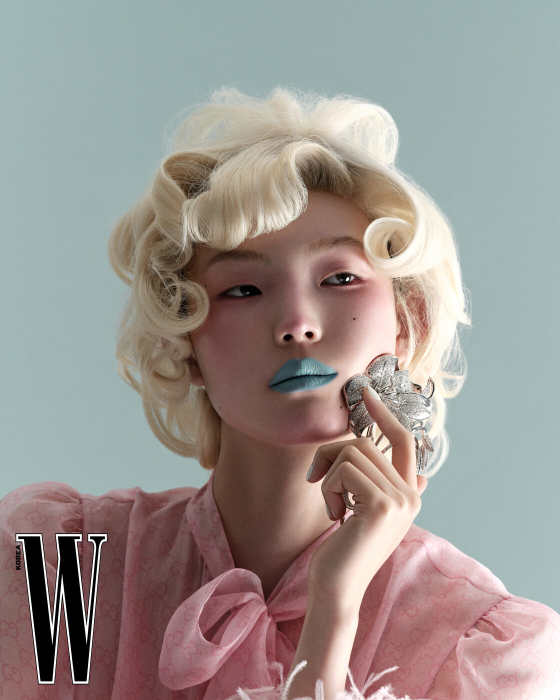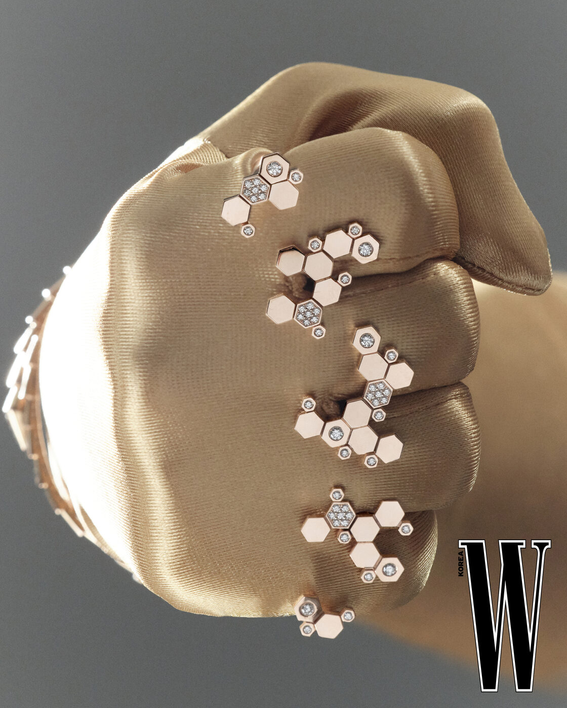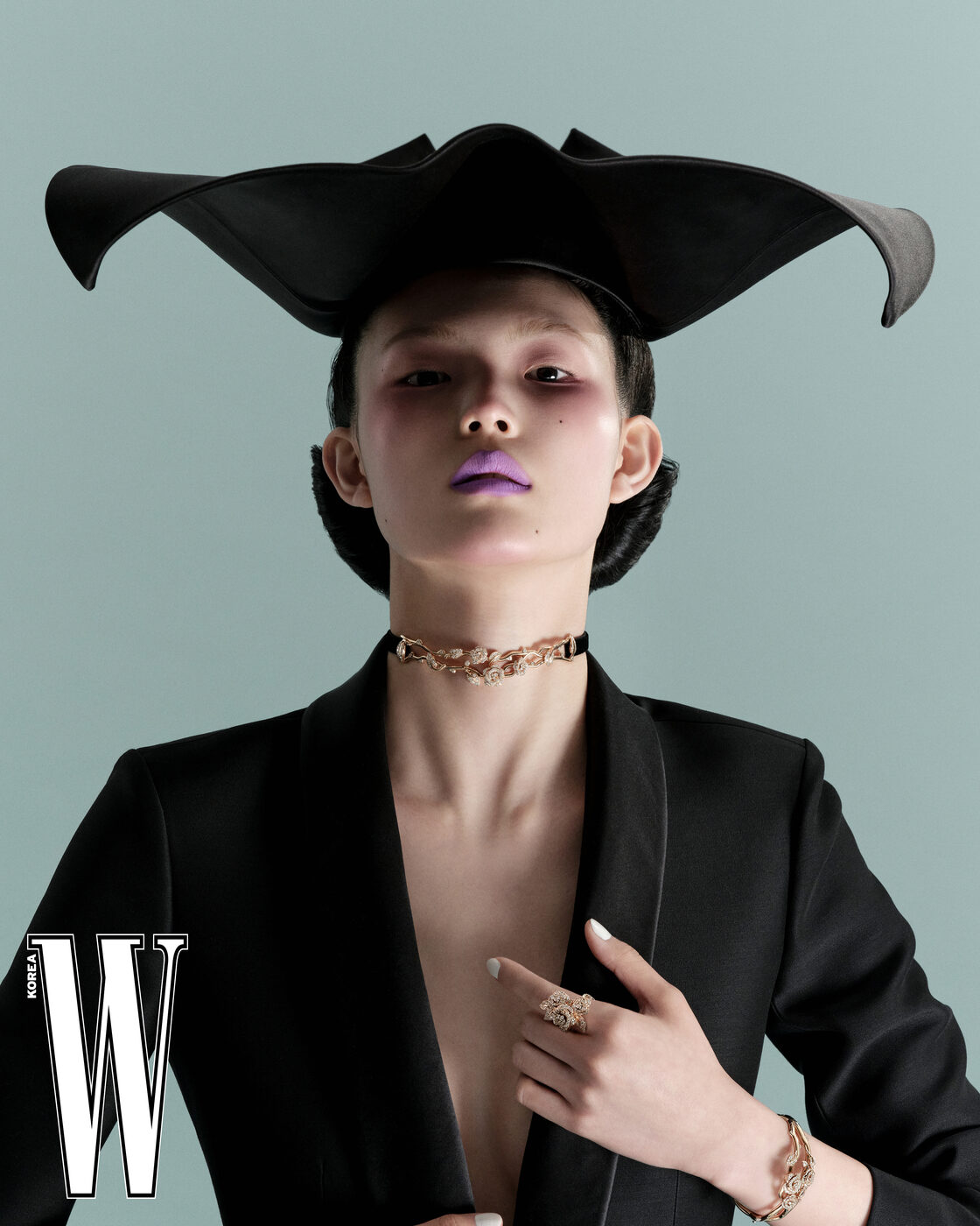 비 드 쇼메 포 핑거 링은 Chaumet, 세르펜티 바이퍼 브레이슬릿은 Bvlgari 제품.