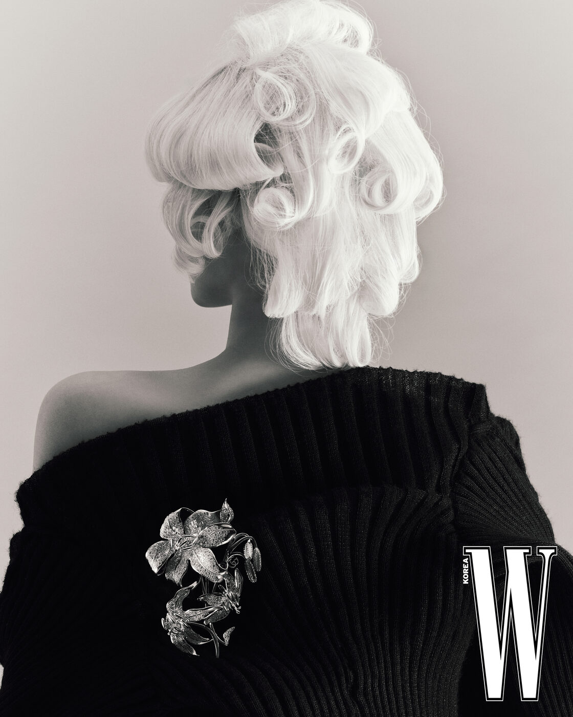 플라워 핀 브로치는 Gucci, 풀오버 톱은 Louis Vuitton 제품.