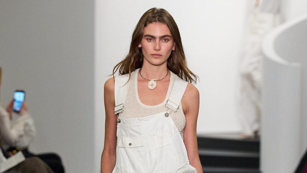 랄프 로렌에서는 올인원 수트로 더욱 다채로운 카고 스타일링을 선보였어요. 누가 카고 팬츠는 터프하기만 하다고 하나요. 새하얀 컬러의 멜빵 바지는 실버 스트랩과 가슴, 그리고 바지 옆에 달린 커다란 주머니 장식으로 매력적인 카고 팬츠의 모습을 갖췄어요. 이너는 심플한 슬리브리스 톱으로 귀엽고 사랑스러운 워크걸 스타일을 완성했죠.