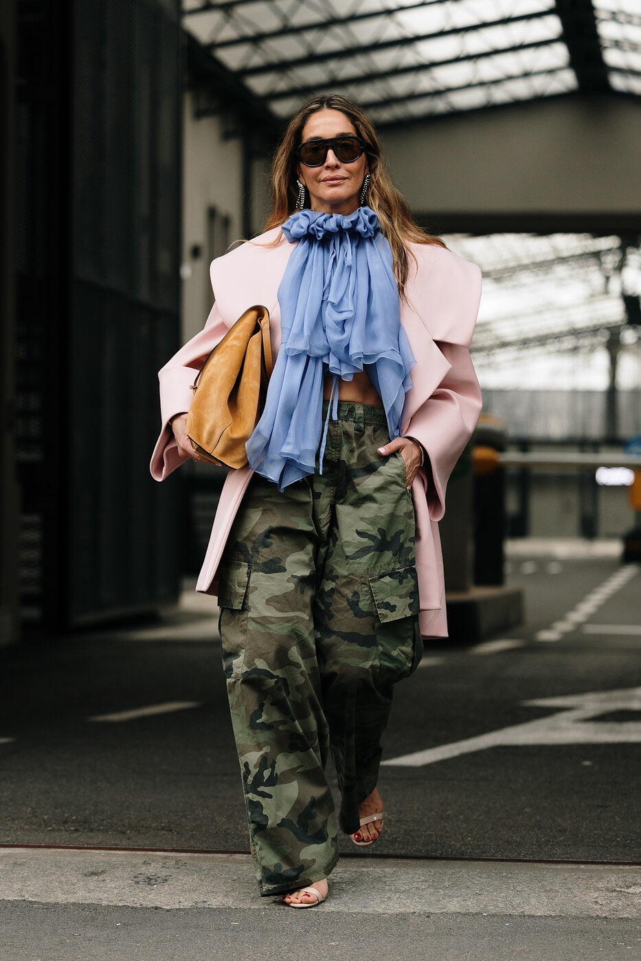 밀리터리 패턴의 매니시함 가득한 카고 팬츠를 이토록 로맨틱한 상의와 매치했습니다. 여성스러운 샌들은 물론, 화려한 러플 장식의 블라우스와 핑크색 아우터까지. 전혀 어울리지 않을 듯한 상반된 스타일의 조화가 흥미롭죠. 그리고 꽤나 잘 어울리구요.