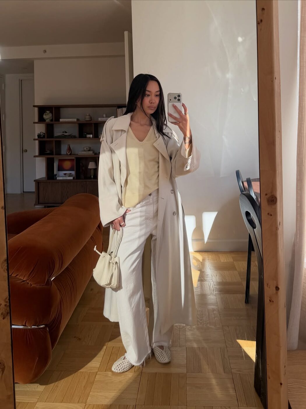 좀 더 화사하게 입고 싶다면 노란 아이템 외에 다른 옷들을 모두 아이보리 컬러로 통일하는 것도 좋은 방법입니다. 새하얀 올 화이트룩 보다 부담도 덜하고, 얇은 트렌치 코트처럼 유연한 소재를 선택한다면 드레시한 효과까지 누릴 수 있죠. 옷차림에 힘을 주고 싶다면 골드 컬러의 주얼리를 더해보는 것도 좋겠어요.
