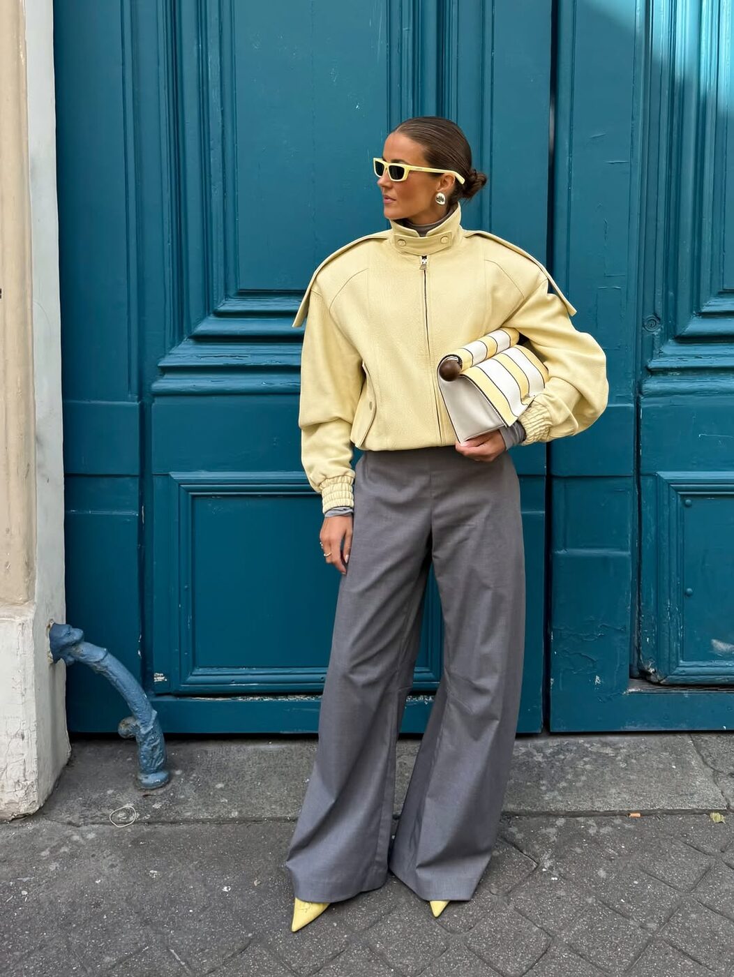 연한 노란색은 여리고 부드러운 컬러지만 포멀한 룩에도 꽤나 잘 어울립니다. 같이 매치할 컬러는 진한 블랙보다는 회색이 톤에 맞죠. 노란색 아우터나 니트에 회색 테일러드 팬츠를 매치한다면 부드러운 뉘앙스의 포멀 룩을 완성할 수 있을거에요.