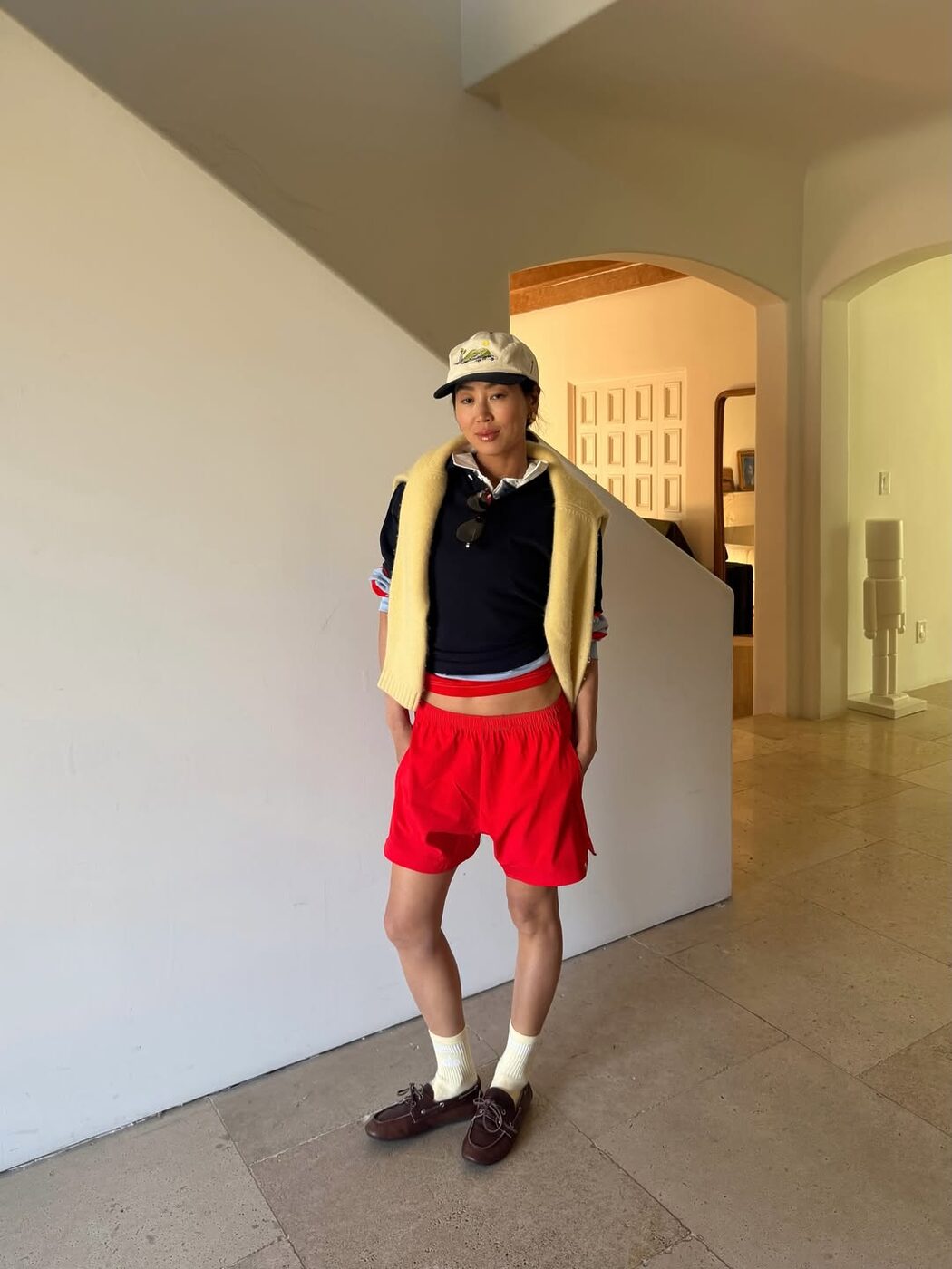 패션 인플루언서 아미 송은 요즘 감각적인 옐로 스타일링을 보여주고 있습니다. 스타일링도 다양한데요. 가장 눈에 띄는 건 원석을 활용한 스포티 룩입니다. 박서 쇼츠, 버뮤다 팬츠 등 선명한 빨간색과 파스텔 노란색의 조합을 즐기는 편. 여기에 네이비 폴로 셔츠와 야구 모자를 더해 남자 아이 같은 귀여운 무드를 완성하기도 하죠. 애매한 파스텔 컬러가 어렵게 느껴진다면 이렇게 존재감 강한 컬러를 조합하는 것도 좋은 방법 중 하나입니다.