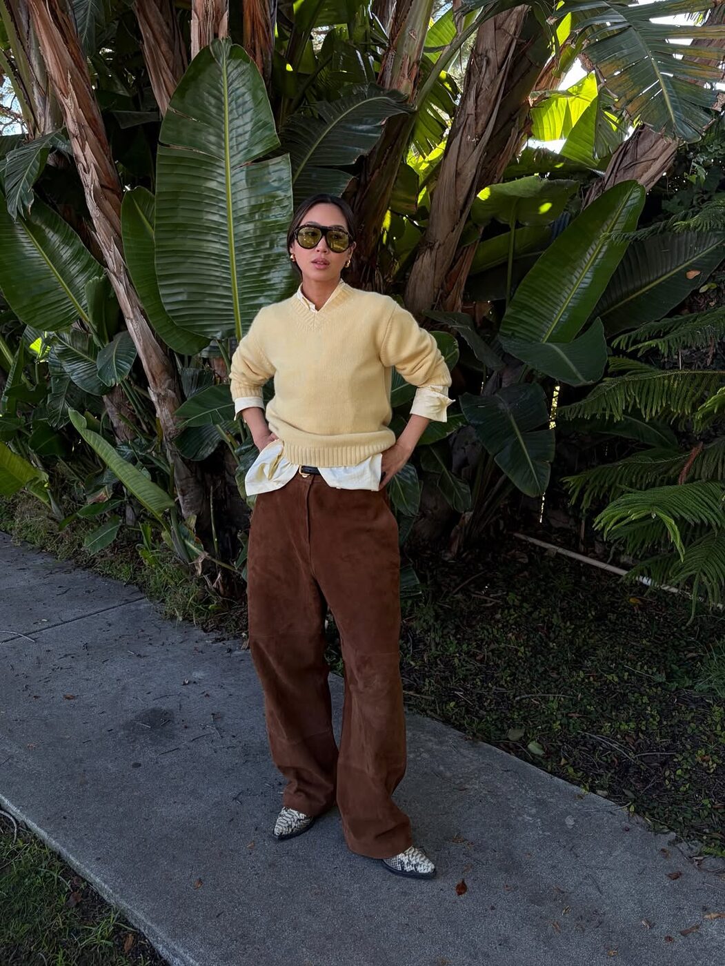 이번엔 성숙한 데일리 룩에 파스텔 옐로 컬러를 활용한 아미 송. 셔츠와 니트를 모두 비슷한 계열의 노란색으로 레이어드하고 여기에 갈색 스웨이드 팬츠를 더하니 노란색이 갖고있는 온화하고 따뜻한 느낌이 극대화됩니다. 여기에 바지 밑단으로 살짝 보이는 파이톤 패턴의 슈즈와 대충 비어져 나온 듯 연출한 셔츠가 룩의 디테일을 살려주네요.