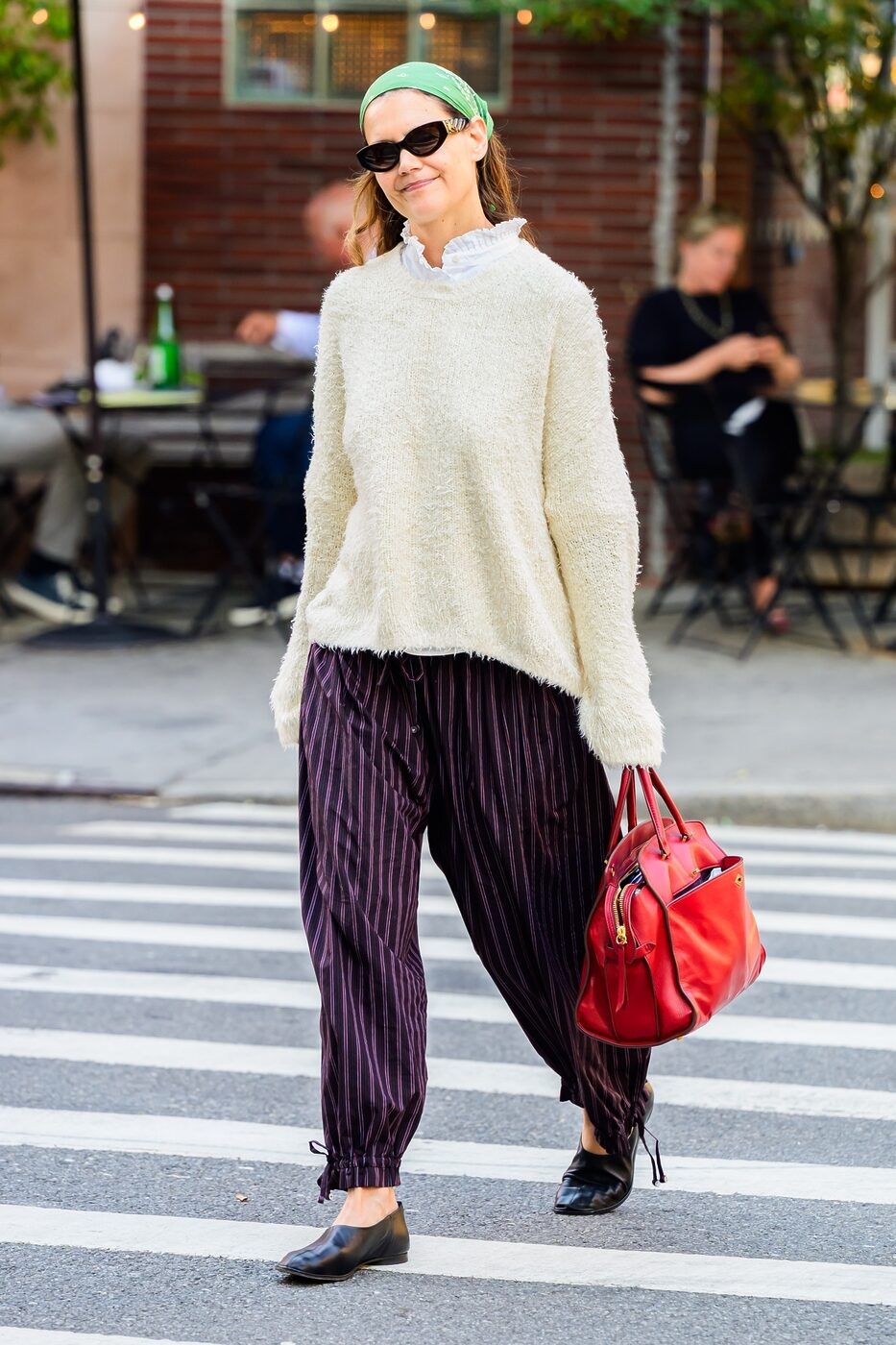 올시즌 은근슬쩍 유행을 타고 있는 아이템이죠, 패피들은 누구나 한벌쯤 있는 발목을 조이는 헐렁한 실루엣의 하렘 팬츠를 입은 케이티 홈즈. 그 위엔 여성스러운 칼라의 셔츠와 오버사이즈의 니트를 설쳐 코지한 분위기를 연출했습니다. 극강의 심플함을 선사하는 블랙 플랫 슈즈와 헤어 스카프까지 쓴 로우 키 무드엔 아주 새빨간 가방을 들어 세련됨의 한 끗을 완성했어요.
