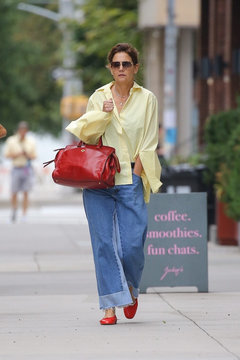 지금 현재 가장 유용할 커다란 사이즈의 셔츠를 활용해도 좋아요. 보기만해도 기분이 좋아지는 버터 옐로우 컬러의 아방가르드한 셔츠엔 투 톤 컬러의 패치워크가 돋보이는 크롭 와이드 데님 팬츠로 체형은 가리고, 시크함은 강조했어요. 옐로우와 블루의 만남에 강렬한 레드 발레 슈즈와 빅 토트 백으로 긴장감을 더한 케이티 홈즈. 늘 편하고 현실적인 옷차림을 추구하는 그녀는 이렇듯 의외의 포인트로 엣지를 더하는 것도 잊지 않습니다.