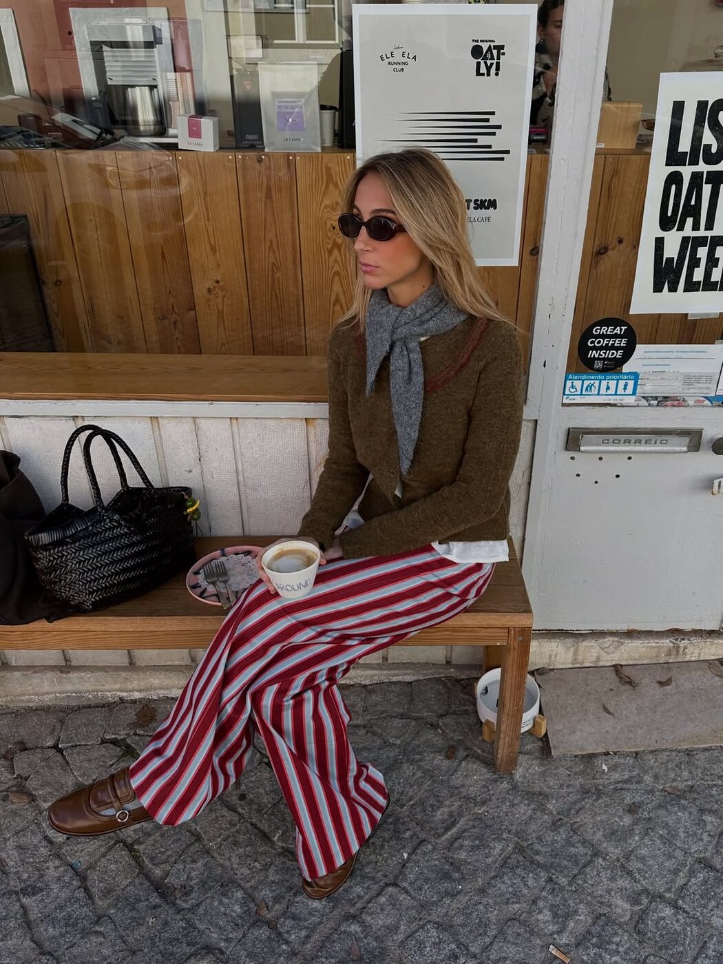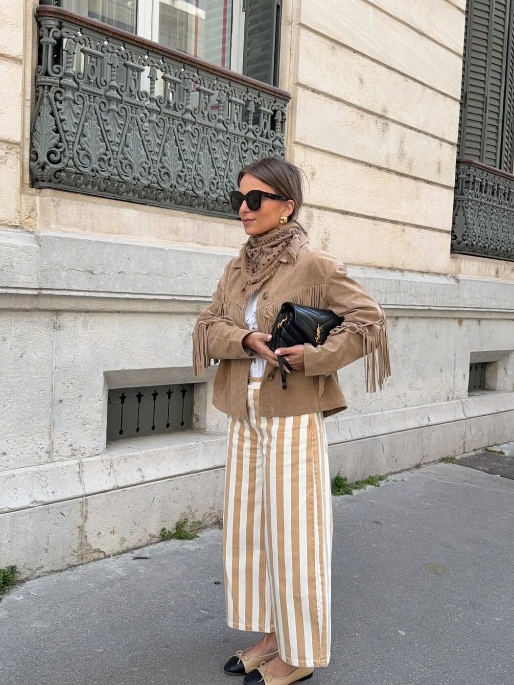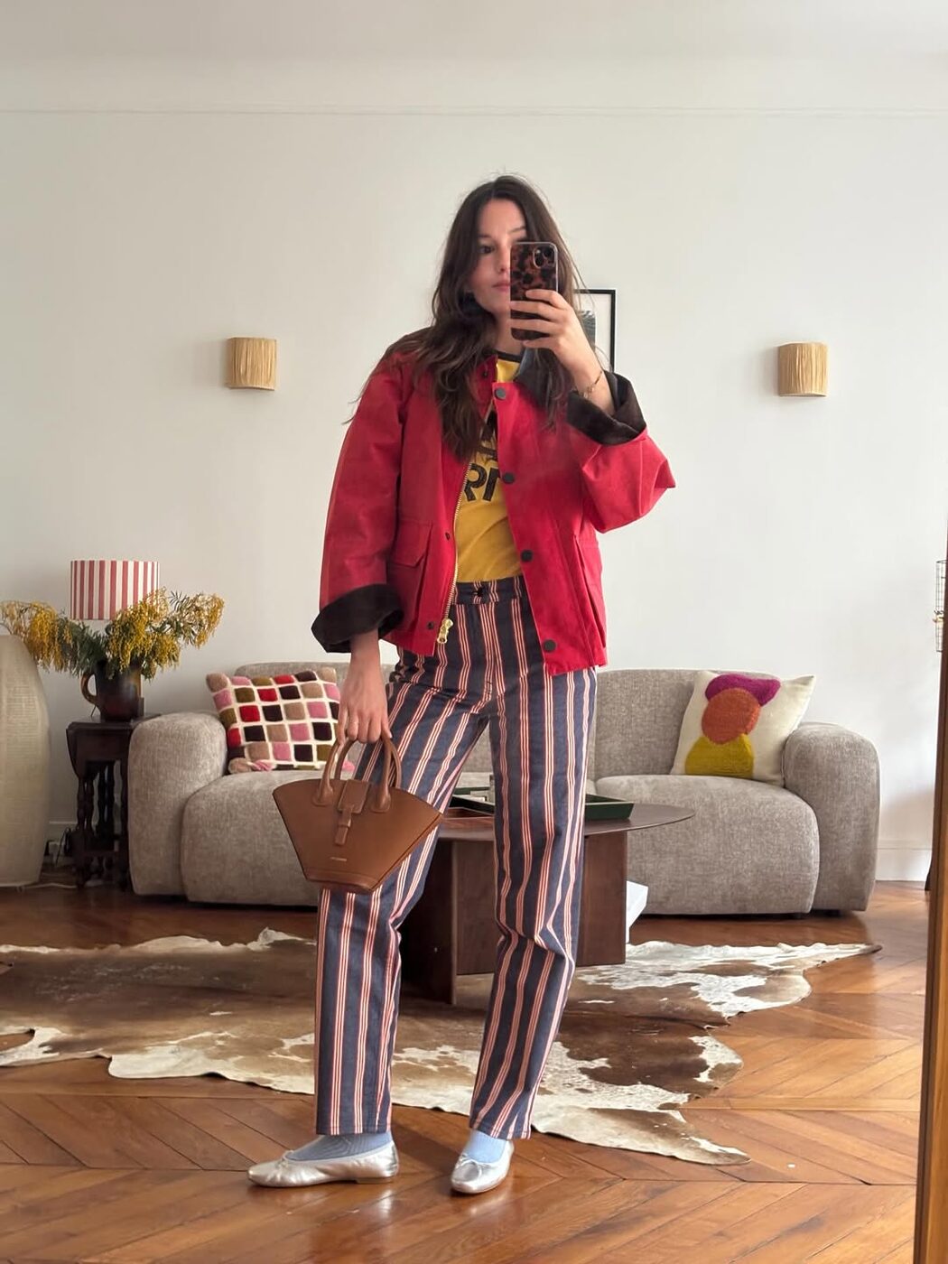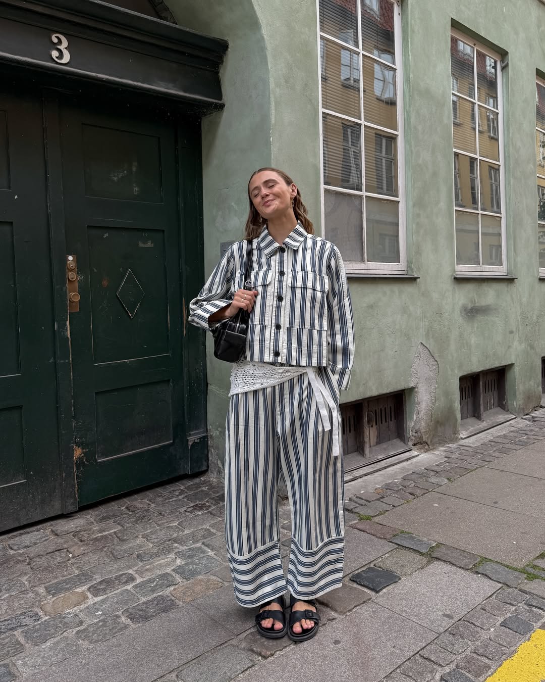 팬츠를 고를 때는 스트라이프 간격과 핏을 함께 고려하는 게 좋아요. 넓은 간격의 스트라이프는 대담하고 강한 인상을 주기 때문에, 세미 와이드 핏처럼 여유 있게 떨어지는 실루엣과 잘 어울려요. 시각적으로 볼륨감이 더해지면서 편안하면서도 스타일리시한 느낌을 만들어주거든요.