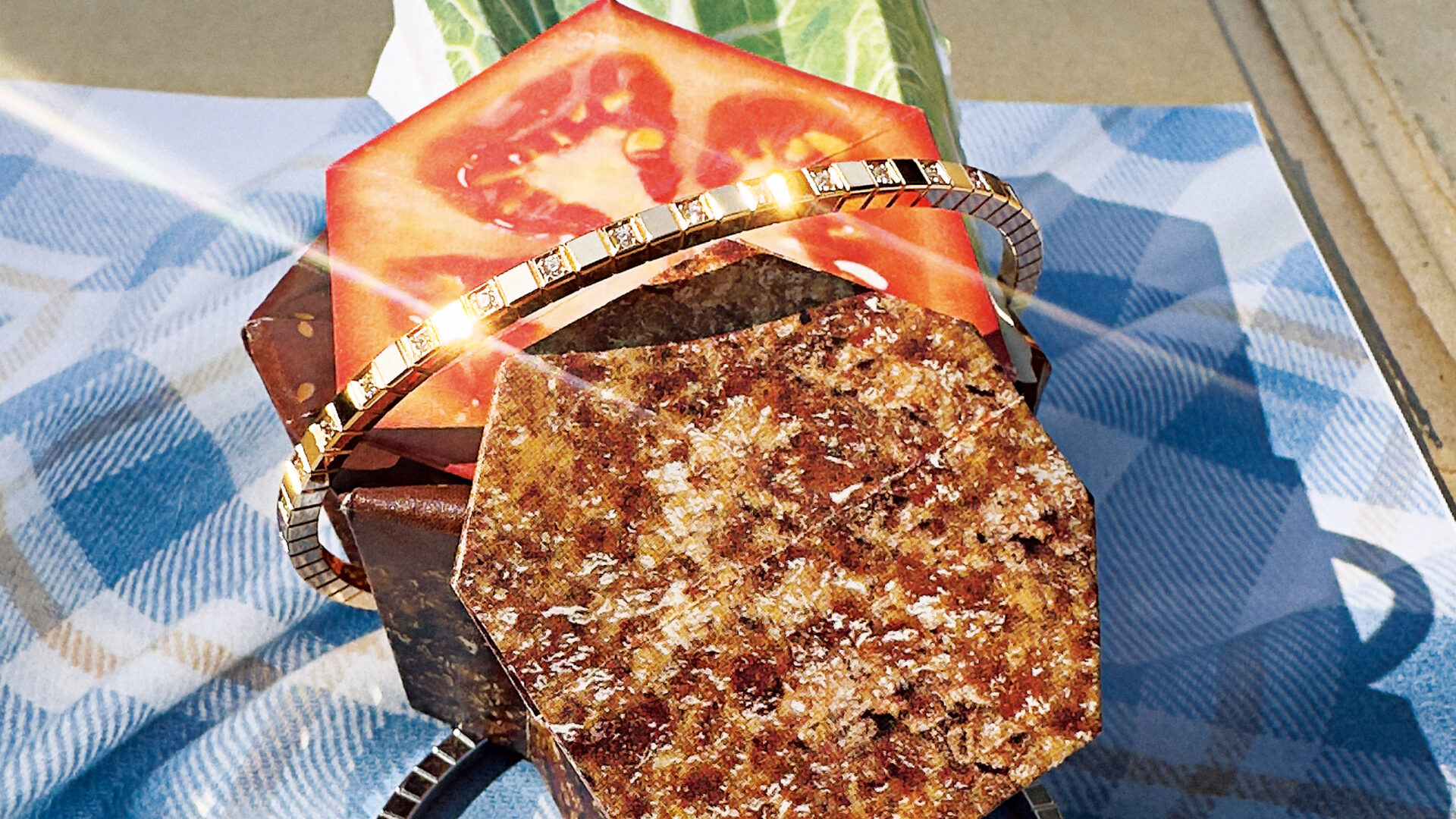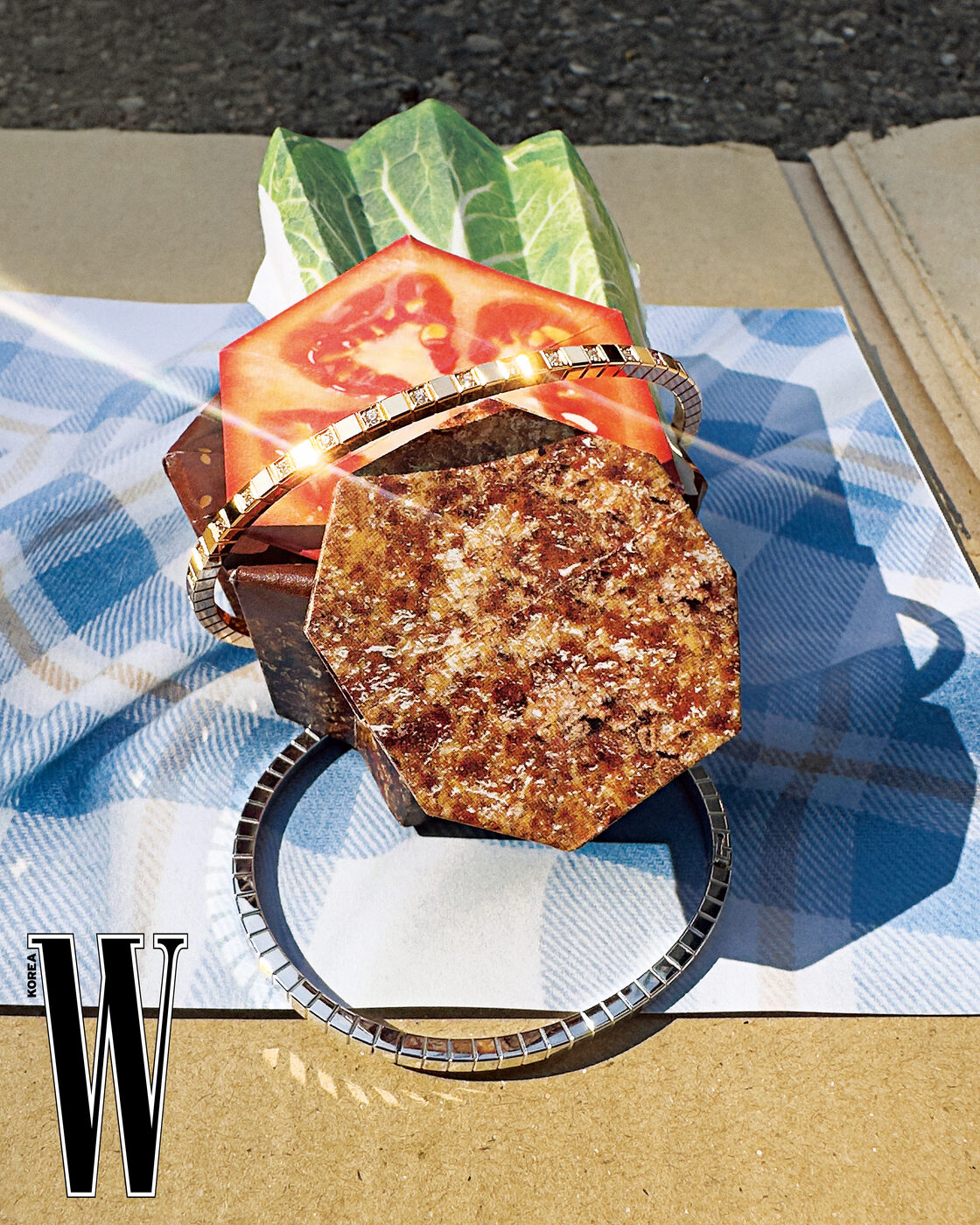 로즈 골드에 다이아몬드를 세팅한 아이스 큐브 뱅글, 화이트 골드 아이스 큐브 뱅글은 Chopard 제품.