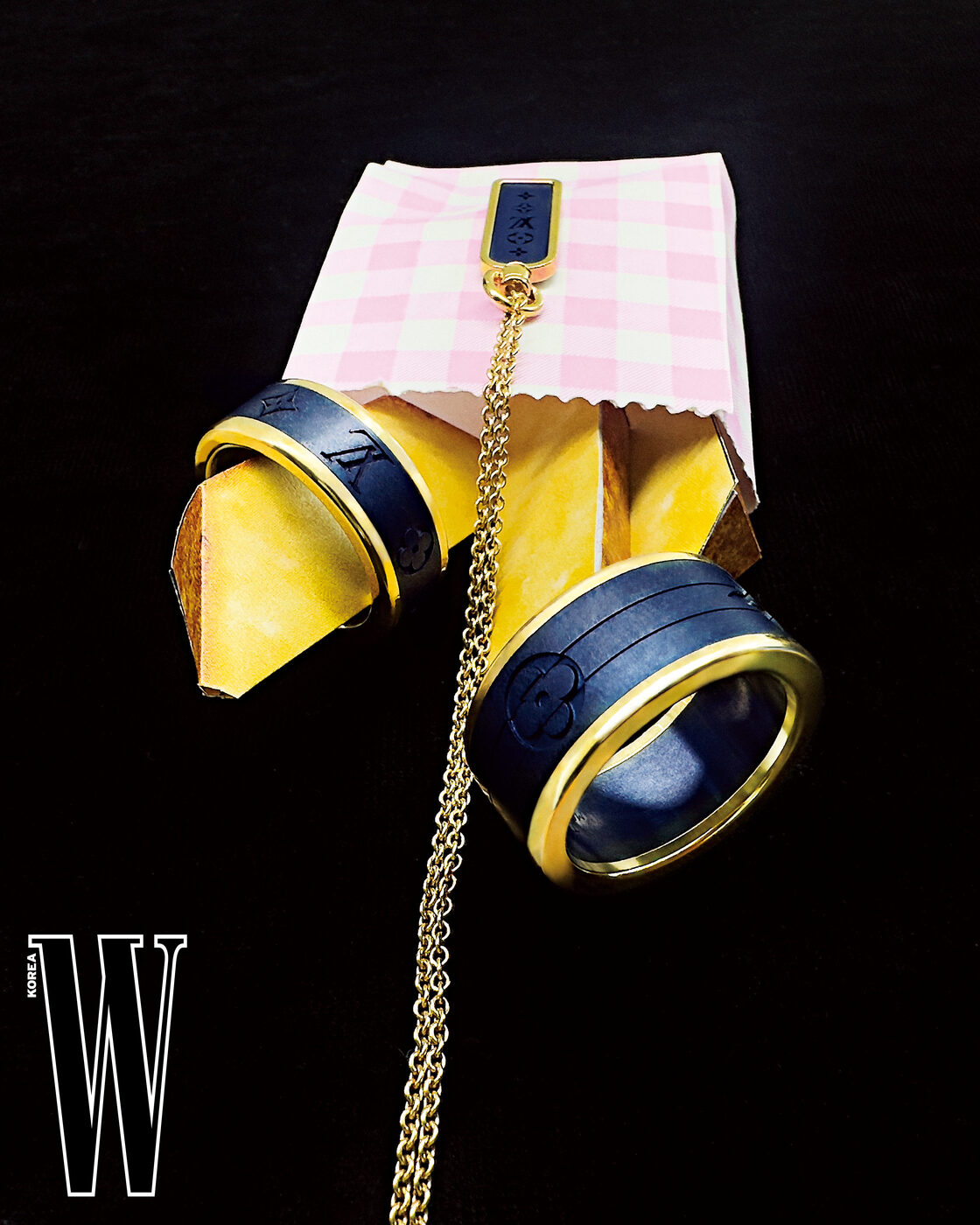 옐로 골드에 티타늄 밴드를 조합한 레 가스통 비통 링, 옐로 골드에 티타늄 밴드를 조합한 레 가스통 비통 퍼즐 링, 옐로 골드에 티타늄을 조합한 레 가스통 비통 스몰 태그 펜던트는 Louis Vuitton 제품.