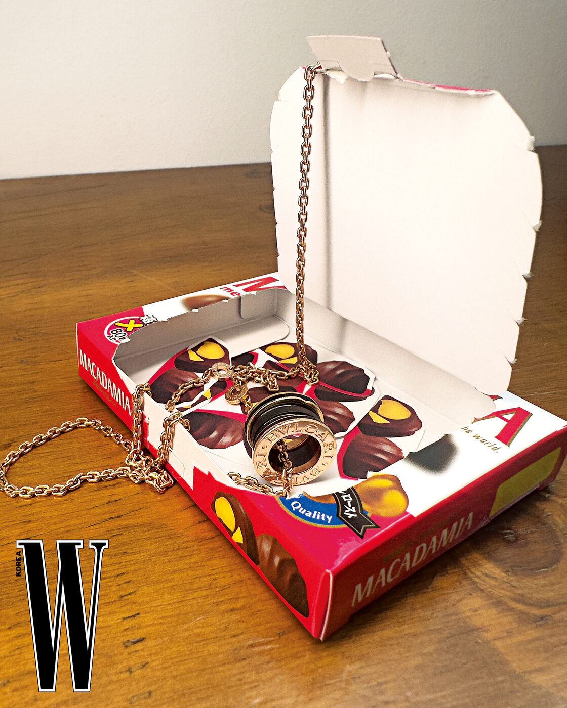 로즈 골드에 세라믹을 결합한 비제로원 네크리스는 Bvlgari 제품.