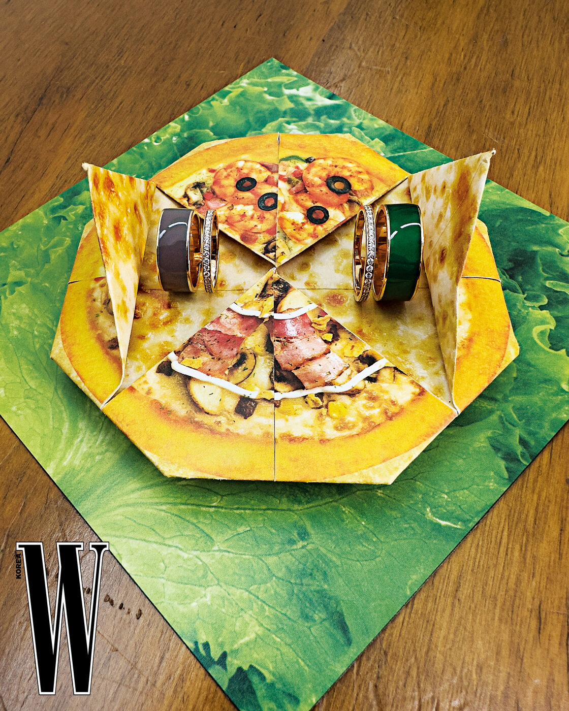 핑크 골드에 다이아몬드와 토프 래커 밴드를 조합한 베르베르 크로마틱 토프 래커 링, 핑크 골드에 다이아몬드와 나일 그린 래커 밴드를 조합한 베르베르 크로마틱 두바이 에디션 나일 그린 래커 링은 Repossi 제품.