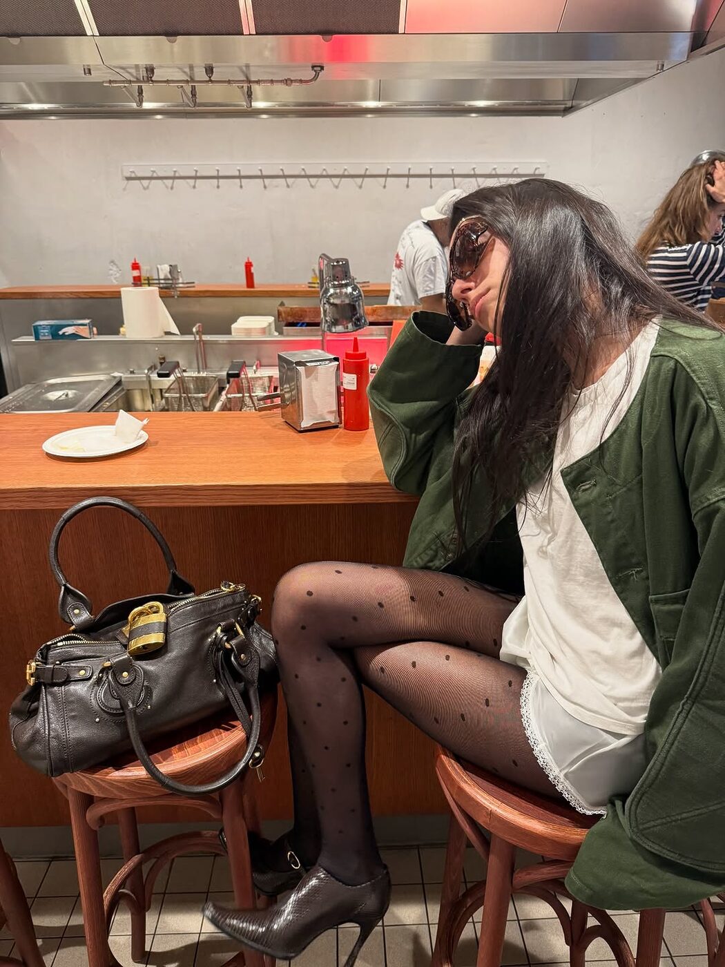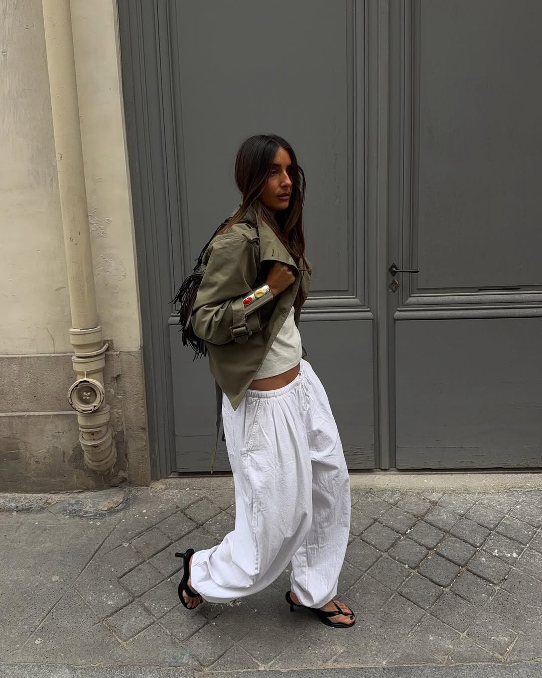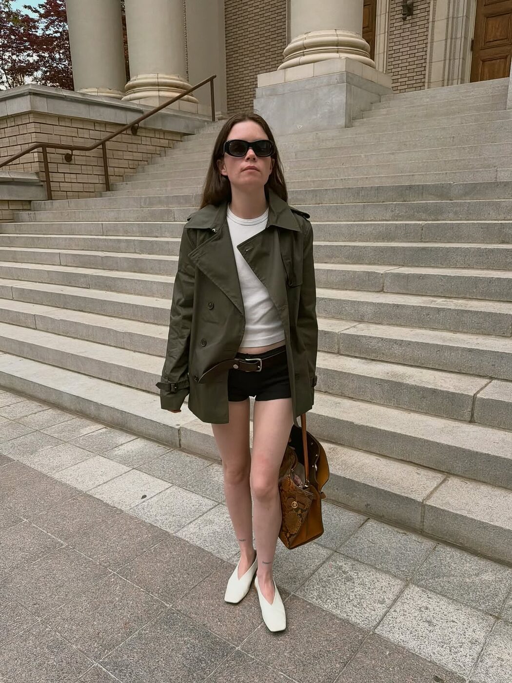 새하얀 티셔츠에 쇼츠, 여기에 힙을 살짝 덮는 카키 아우터를 매치했습니다. 다른 아이템을 화이트와 블랙처럼 모노 톤으로 정리하니 카키 특유의 담백한 매력이 돋보이네요. 미묘하게 감도는 그린의 기운 덕에 무채색보다는 확실한 포인트를 더하는 역할도 하죠.